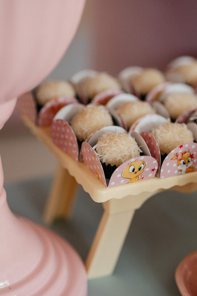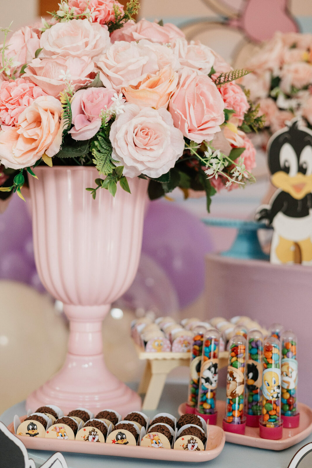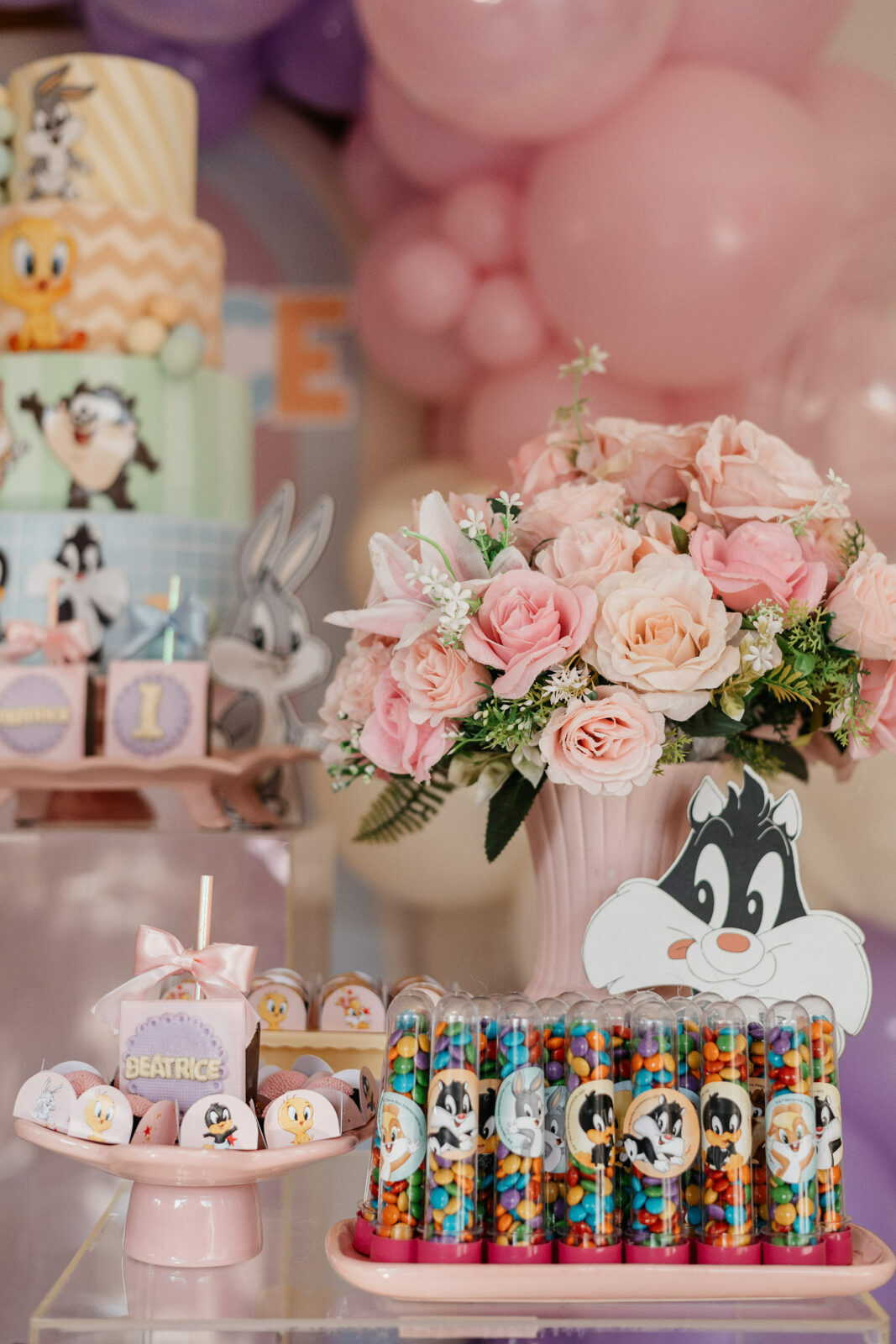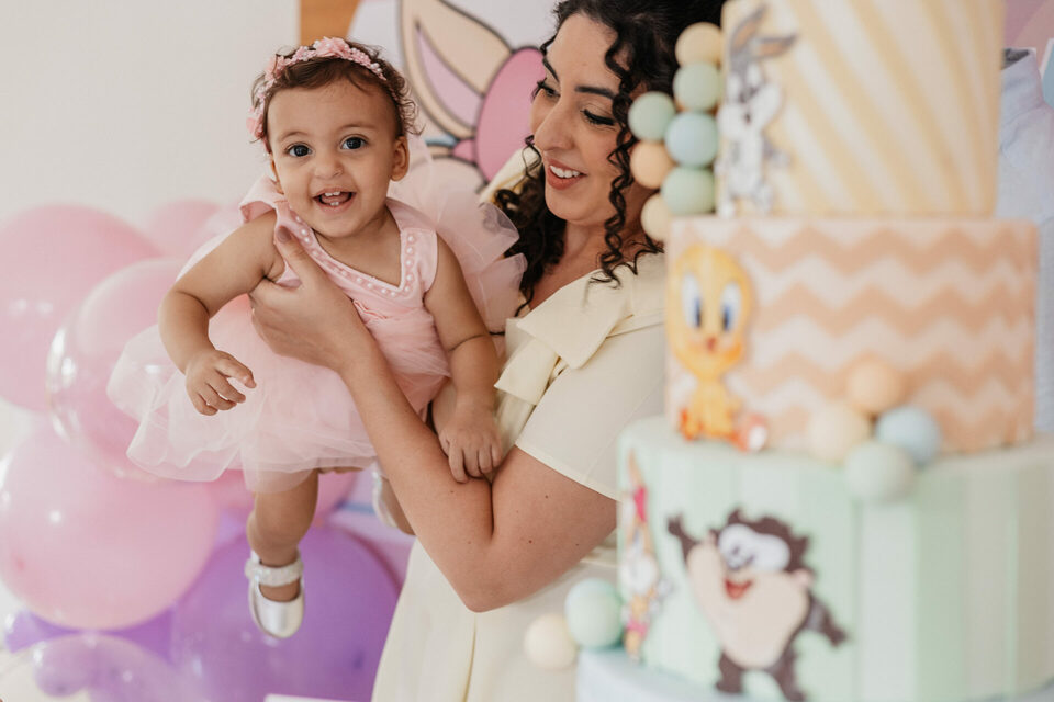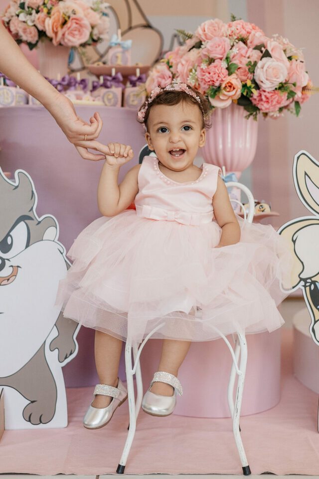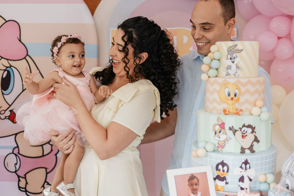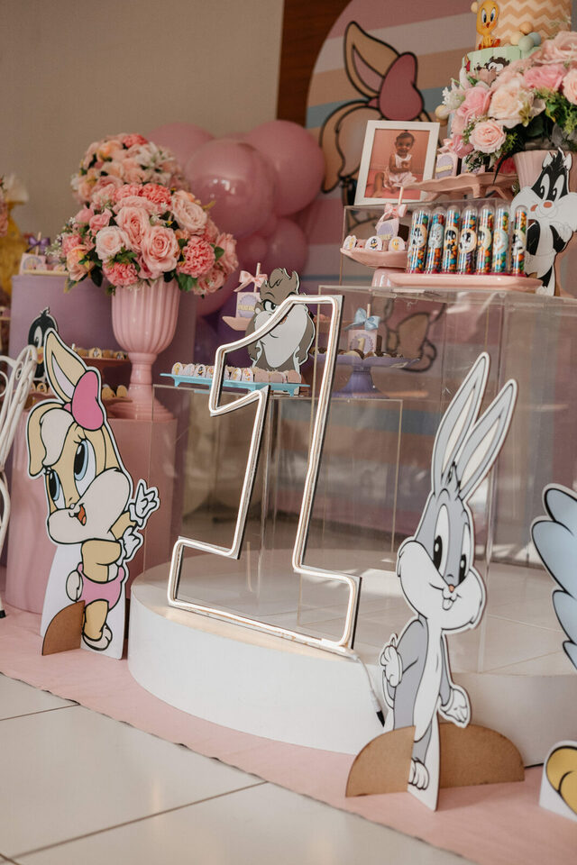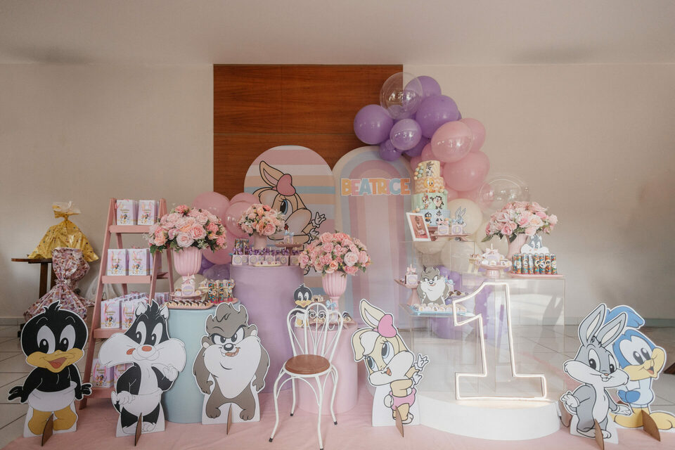 No salão de festas do condomínio, o cenário ganhou cores suaves em tons de rosa e lilás, onde personagens clássicos do universo Looney Tunes pareciam ter sido convidados especiais para celebrar. Entre balões delicados, flores em tons pastéis e uma mesa cuidadosamente preparada, cada detalhe revelava uma escolha feita com carinho — daquelas que não precisam de exagero para emocionar.