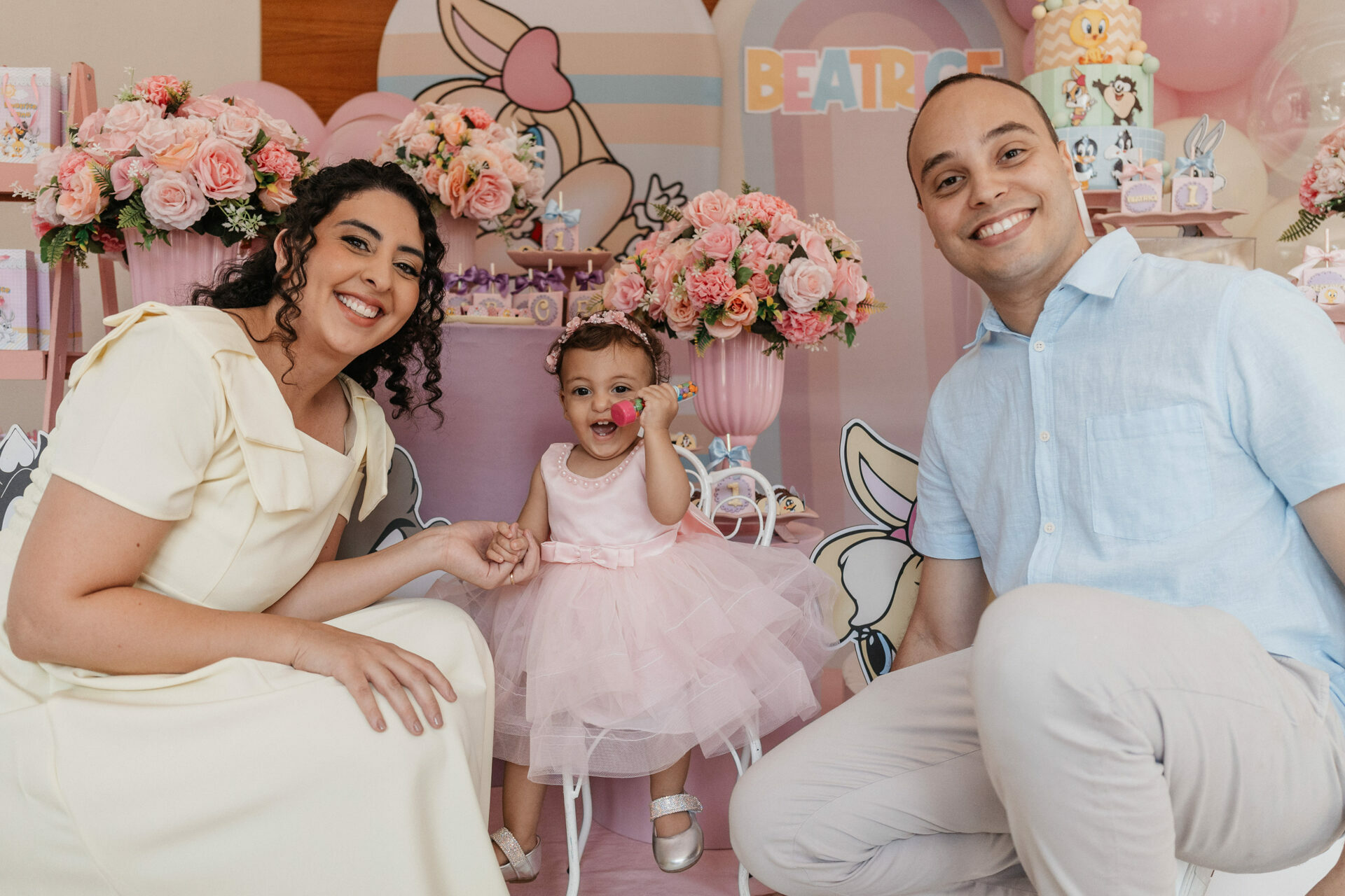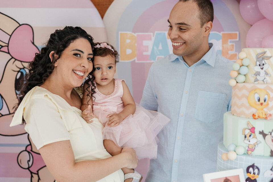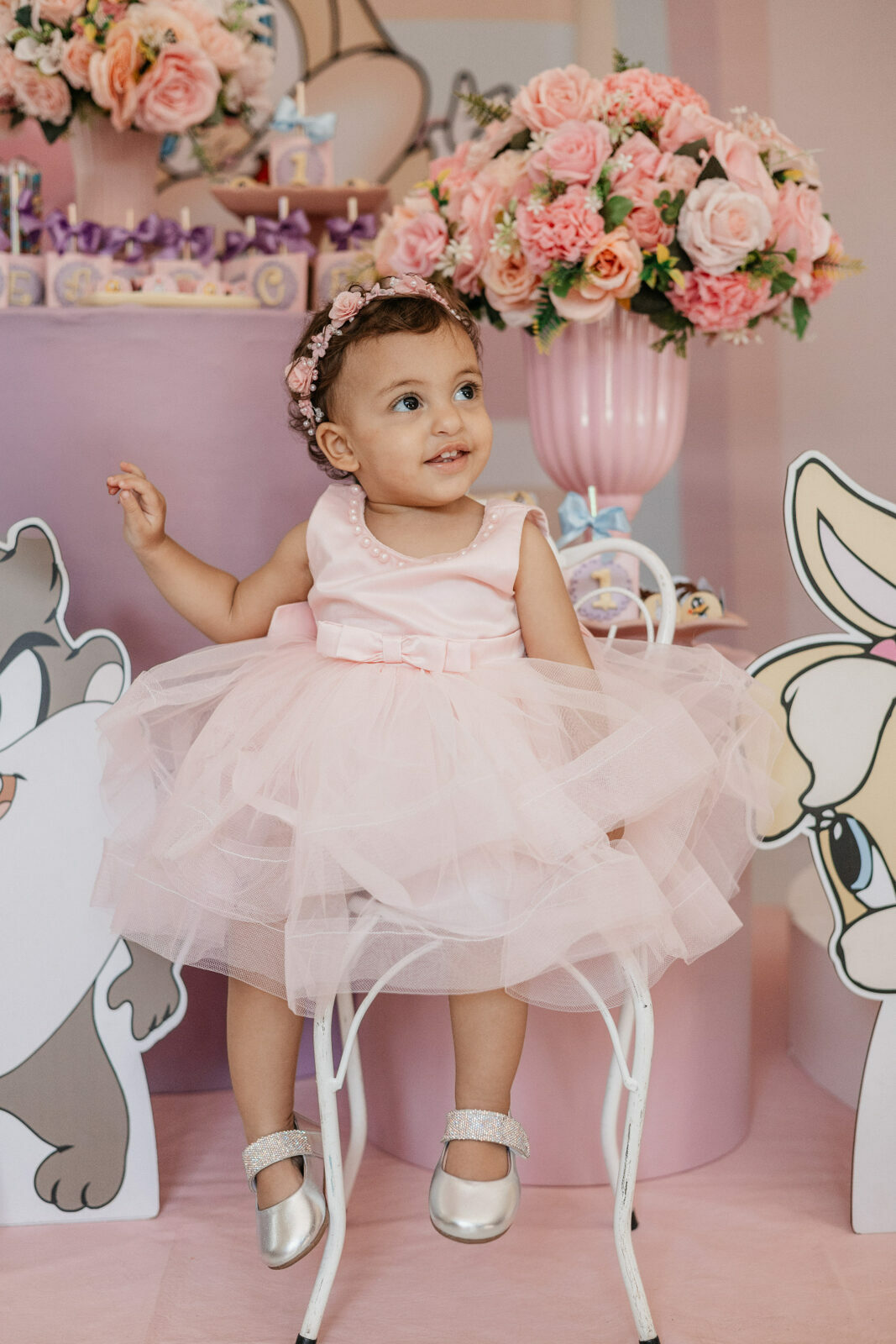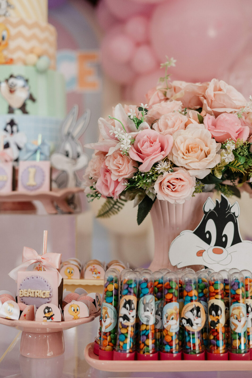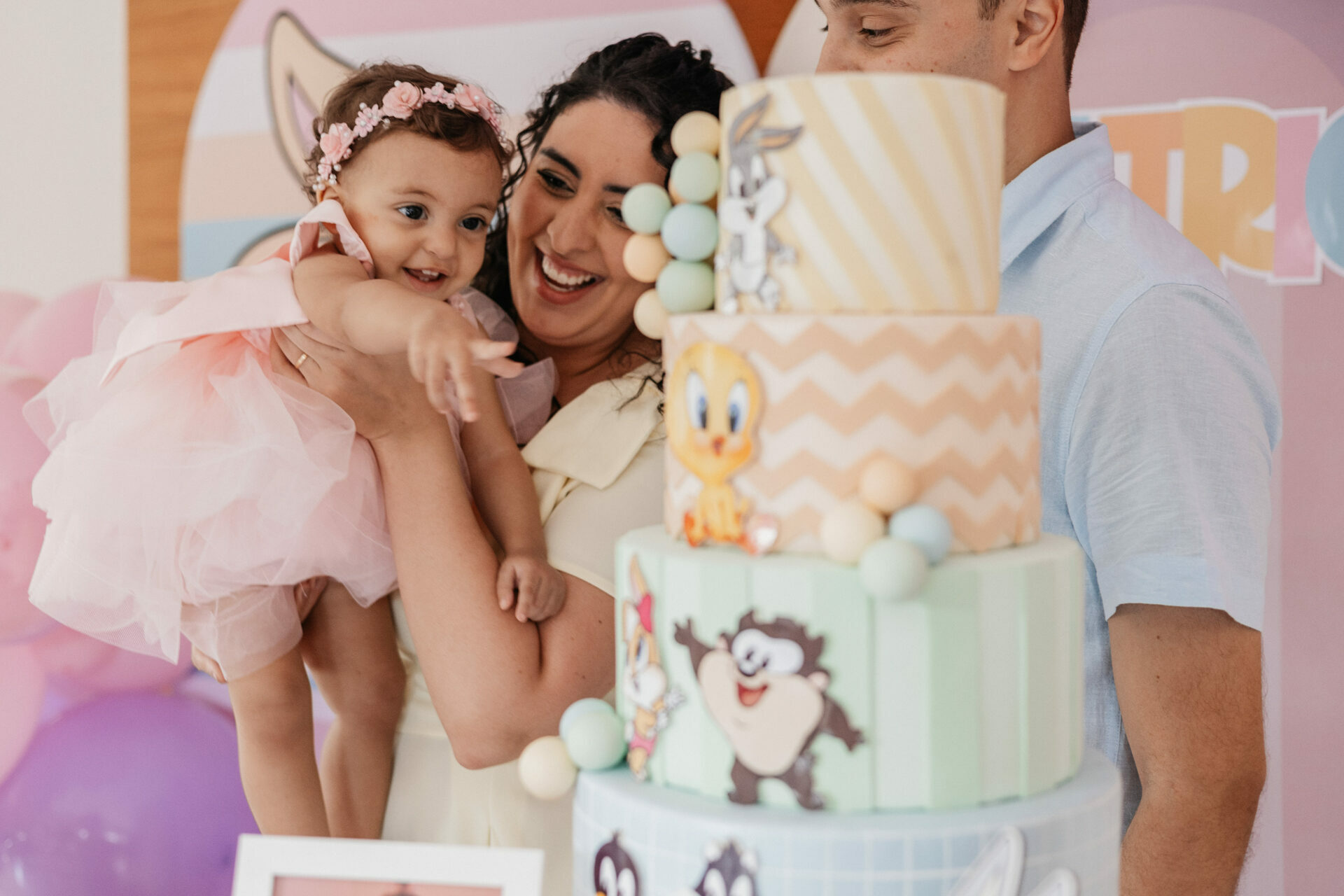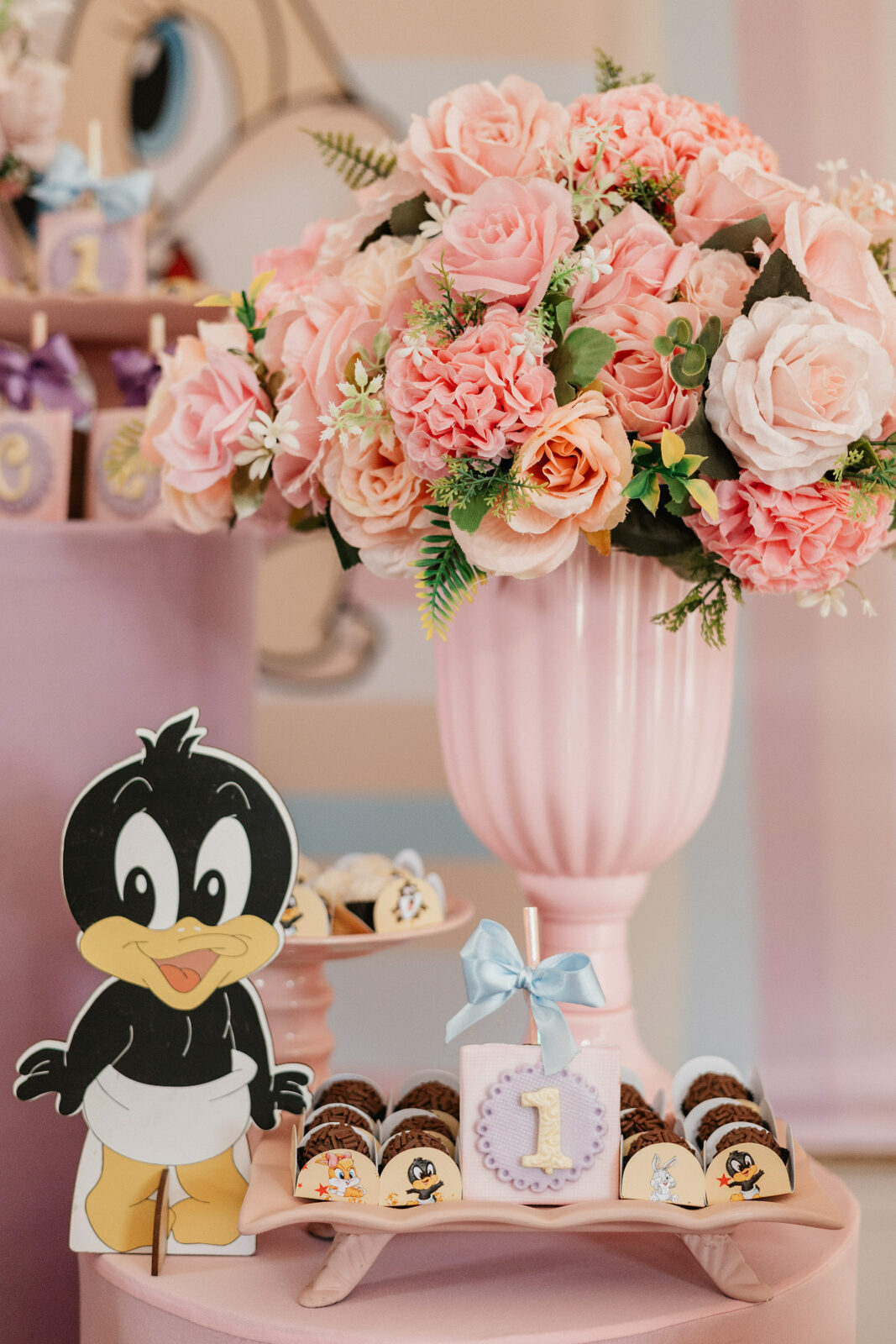 No salão de festas do condomínio, o cenário ganhou cores suaves em tons de rosa e lilás, onde personagens clássicos do universo Looney Tunes pareciam ter sido convidados especiais para celebrar. Entre balões delicados, flores em tons pastéis e uma mesa cuidadosamente preparada, cada detalhe revelava uma escolha feita com carinho — daquelas que não precisam de exagero para emocionar.