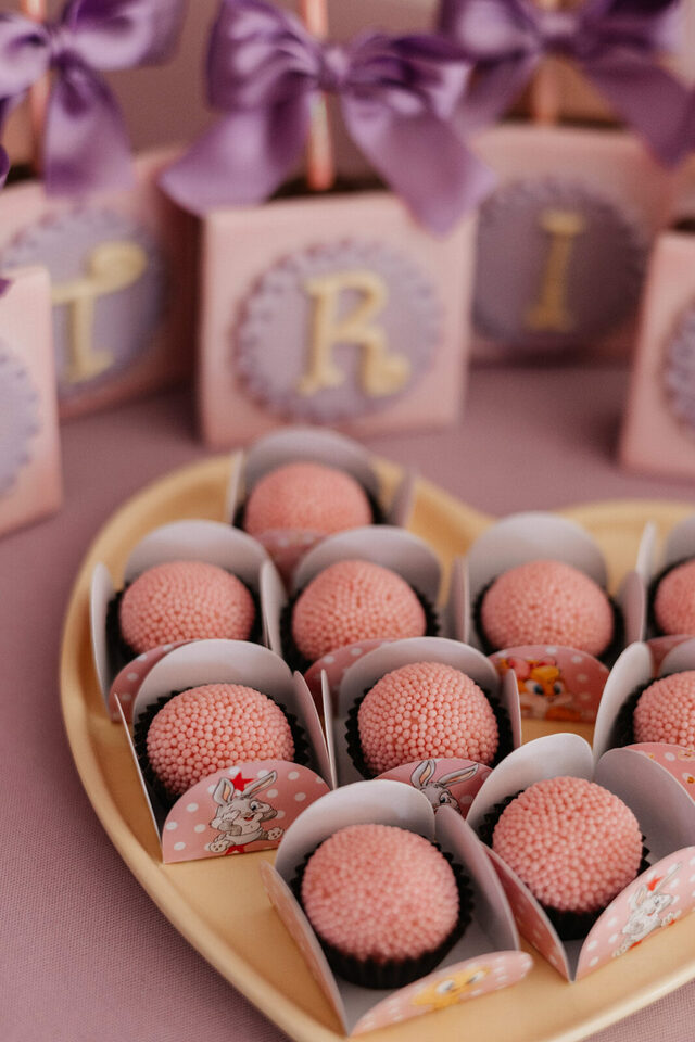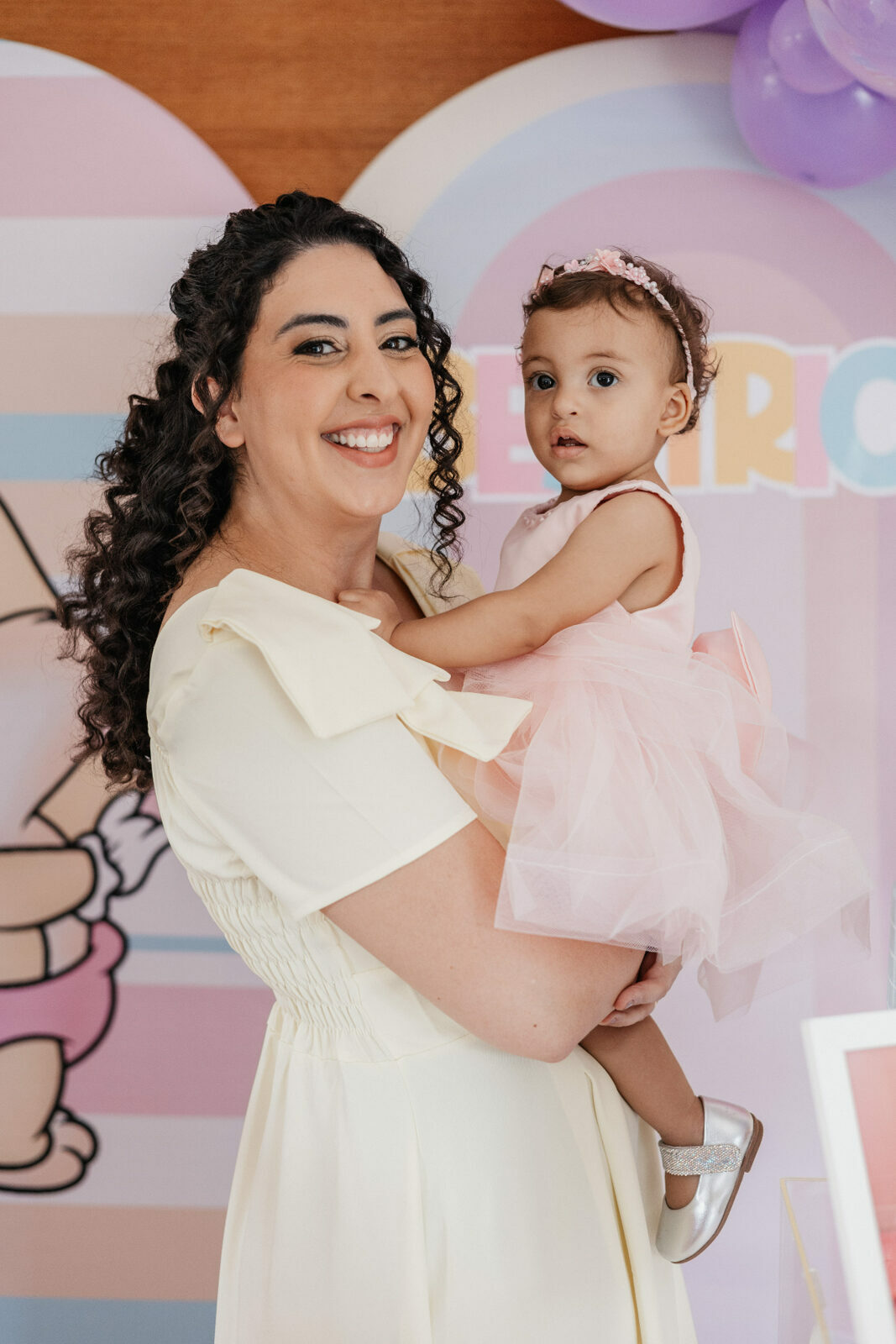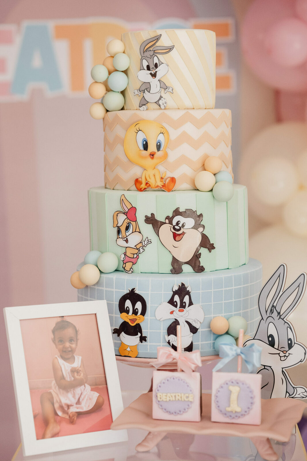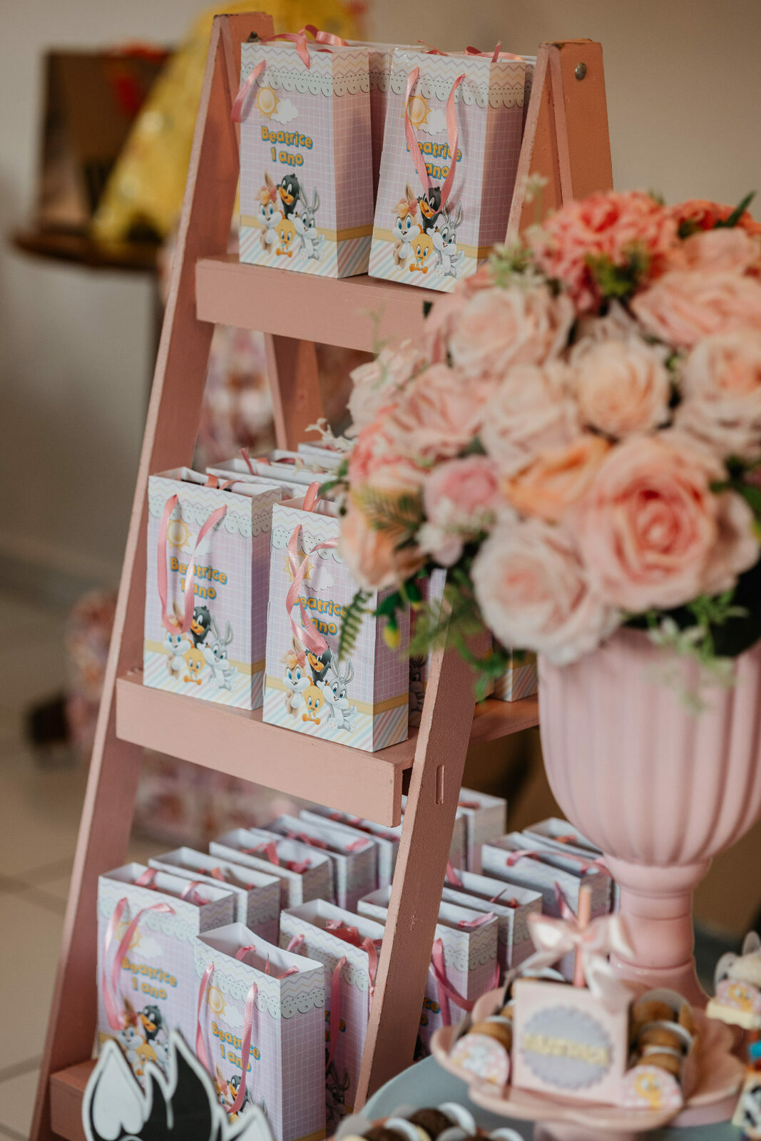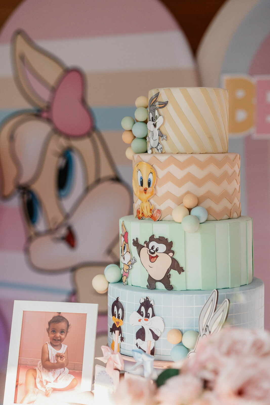 No salão de festas do condomínio, o cenário ganhou cores suaves em tons de rosa e lilás, onde personagens clássicos do universo Looney Tunes pareciam ter sido convidados especiais para celebrar. Entre balões delicados, flores em tons pastéis e uma mesa cuidadosamente preparada, cada detalhe revelava uma escolha feita com carinho — daquelas que não precisam de exagero para emocionar.