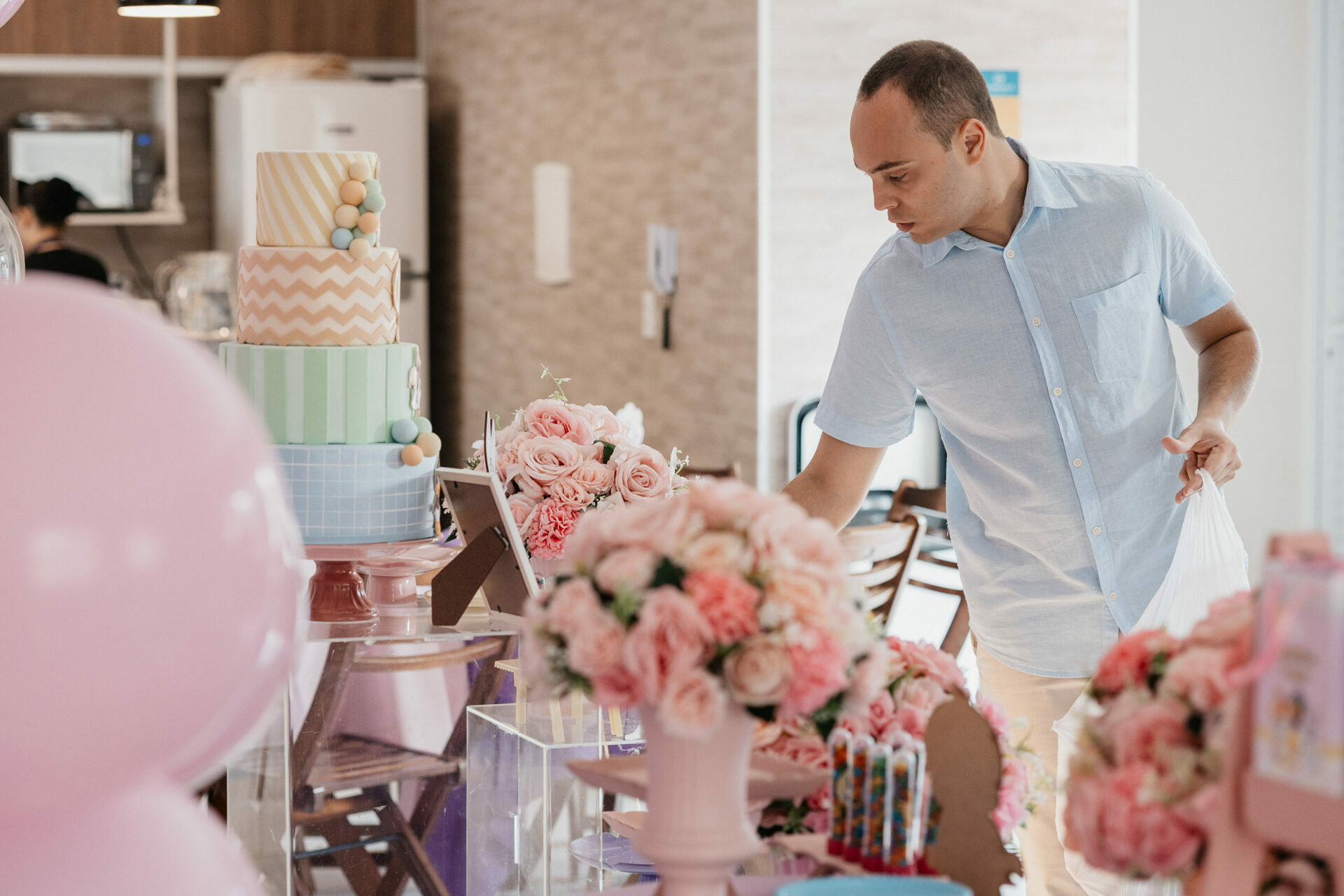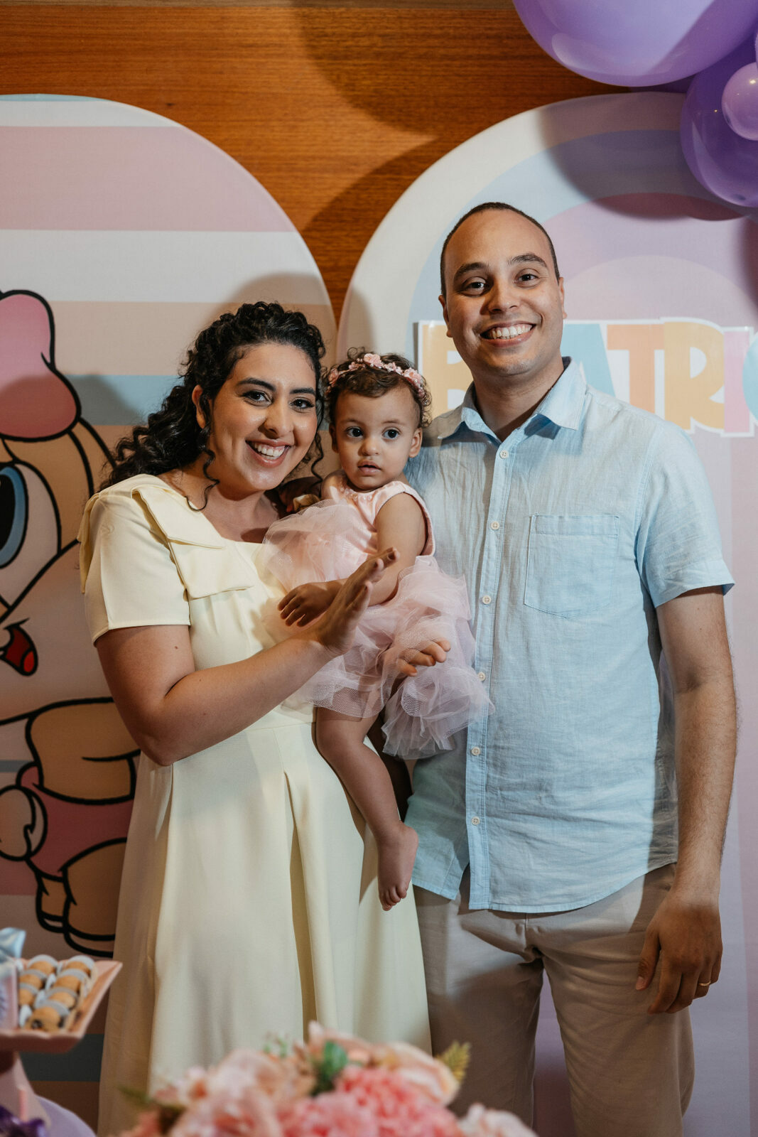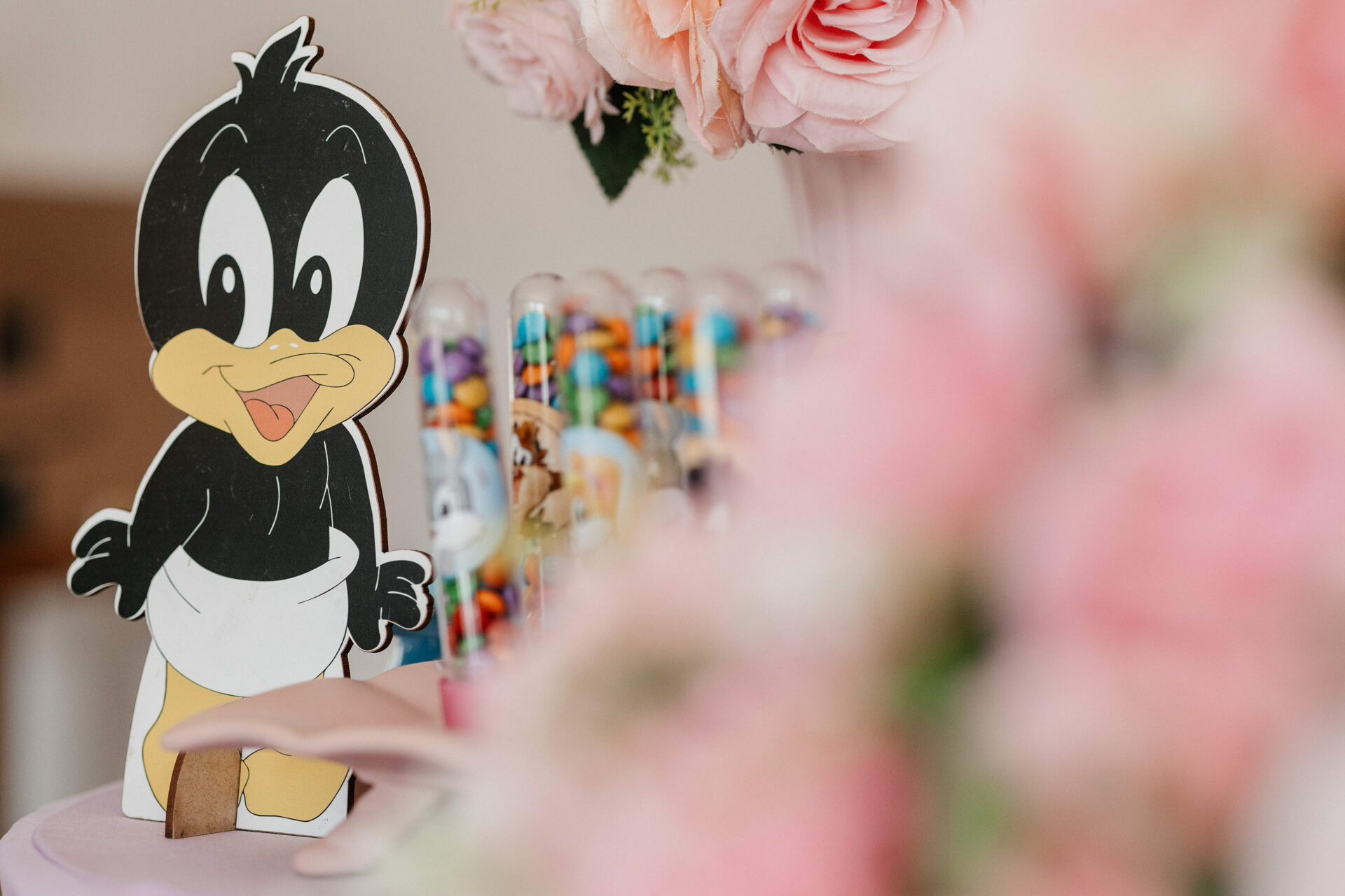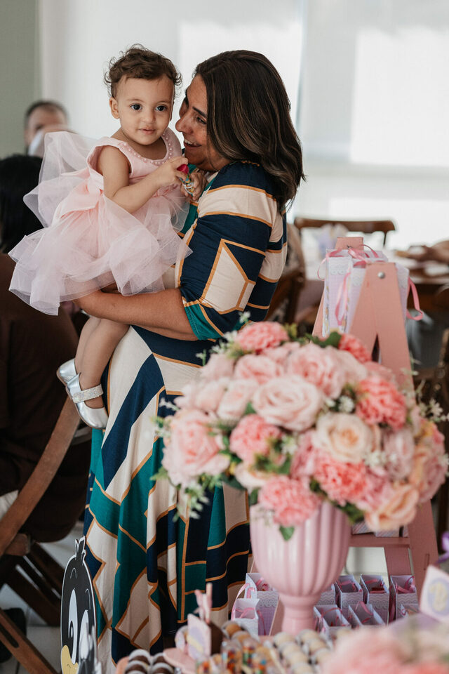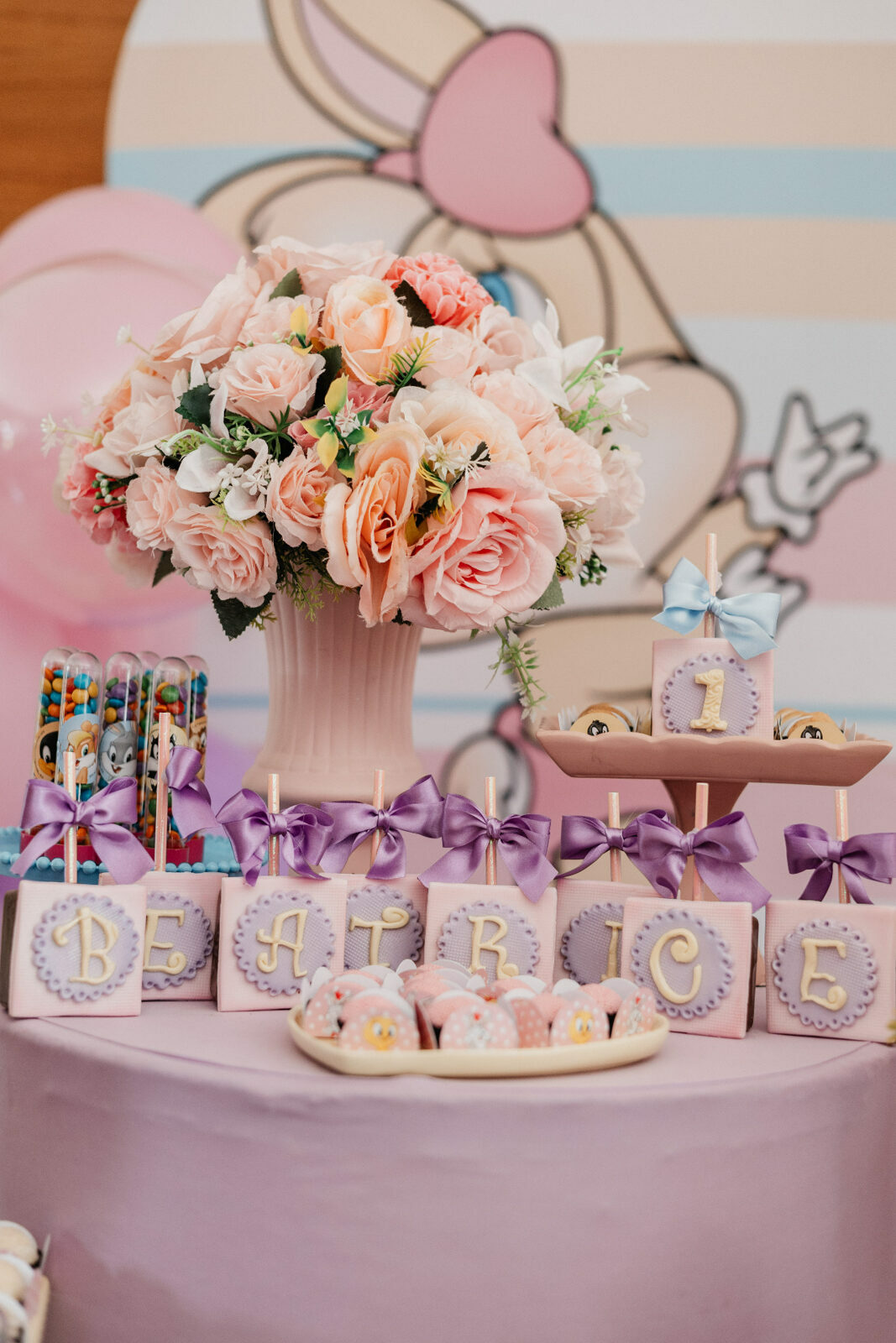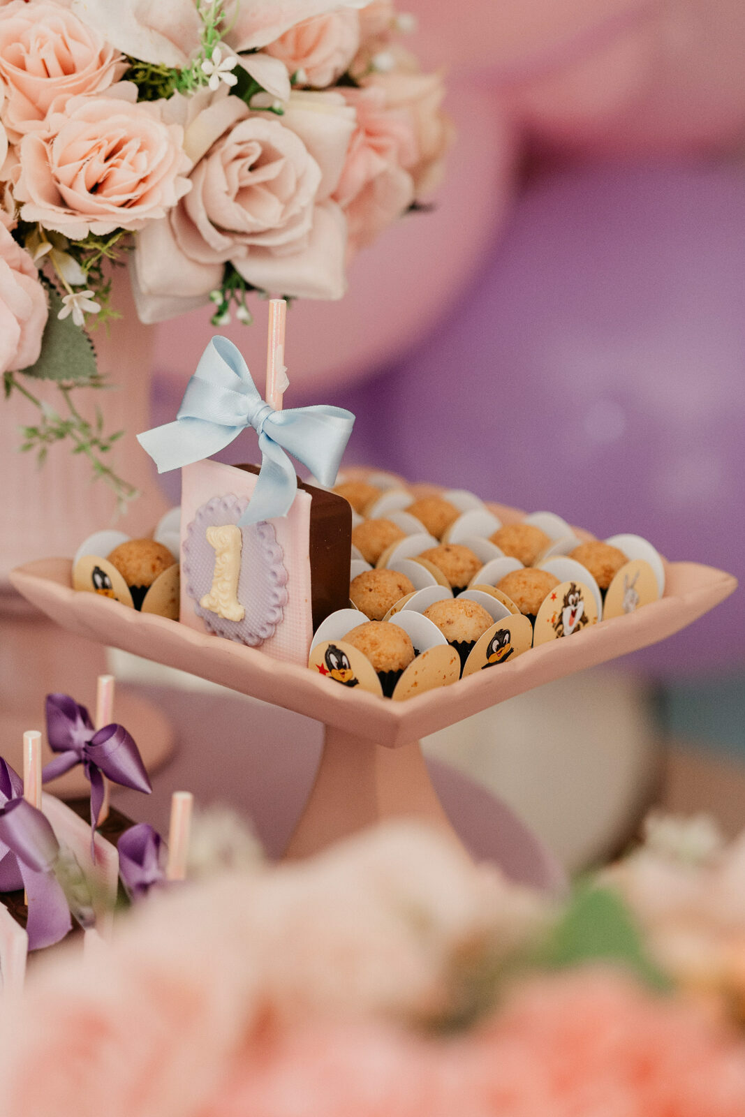 No salão de festas do condomínio, o cenário ganhou cores suaves em tons de rosa e lilás, onde personagens clássicos do universo Looney Tunes pareciam ter sido convidados especiais para celebrar. Entre balões delicados, flores em tons pastéis e uma mesa cuidadosamente preparada, cada detalhe revelava uma escolha feita com carinho — daquelas que não precisam de exagero para emocionar.