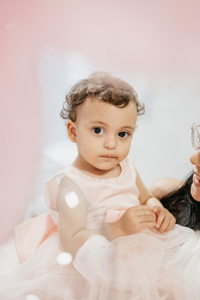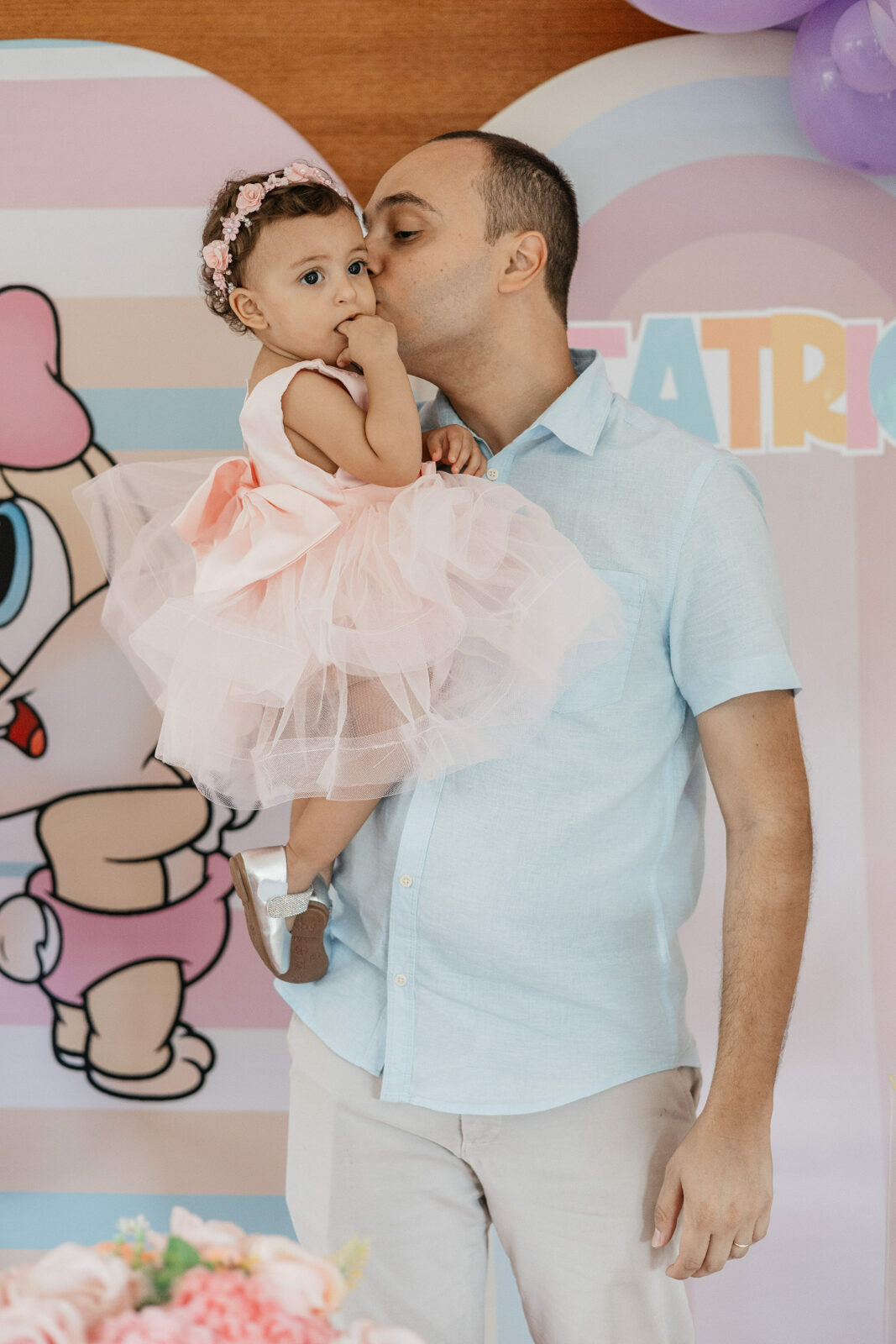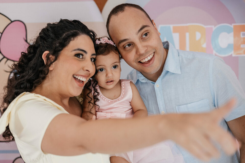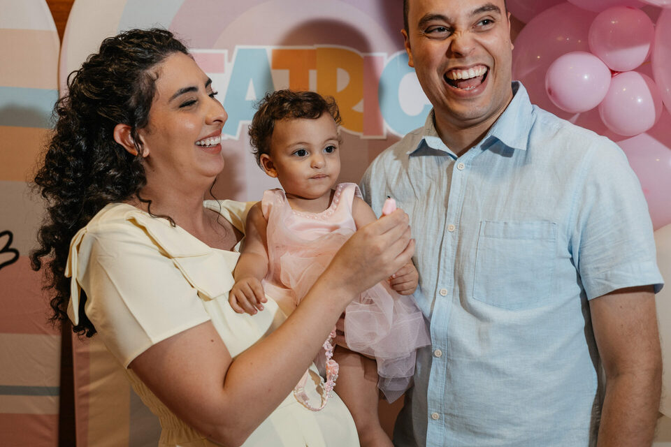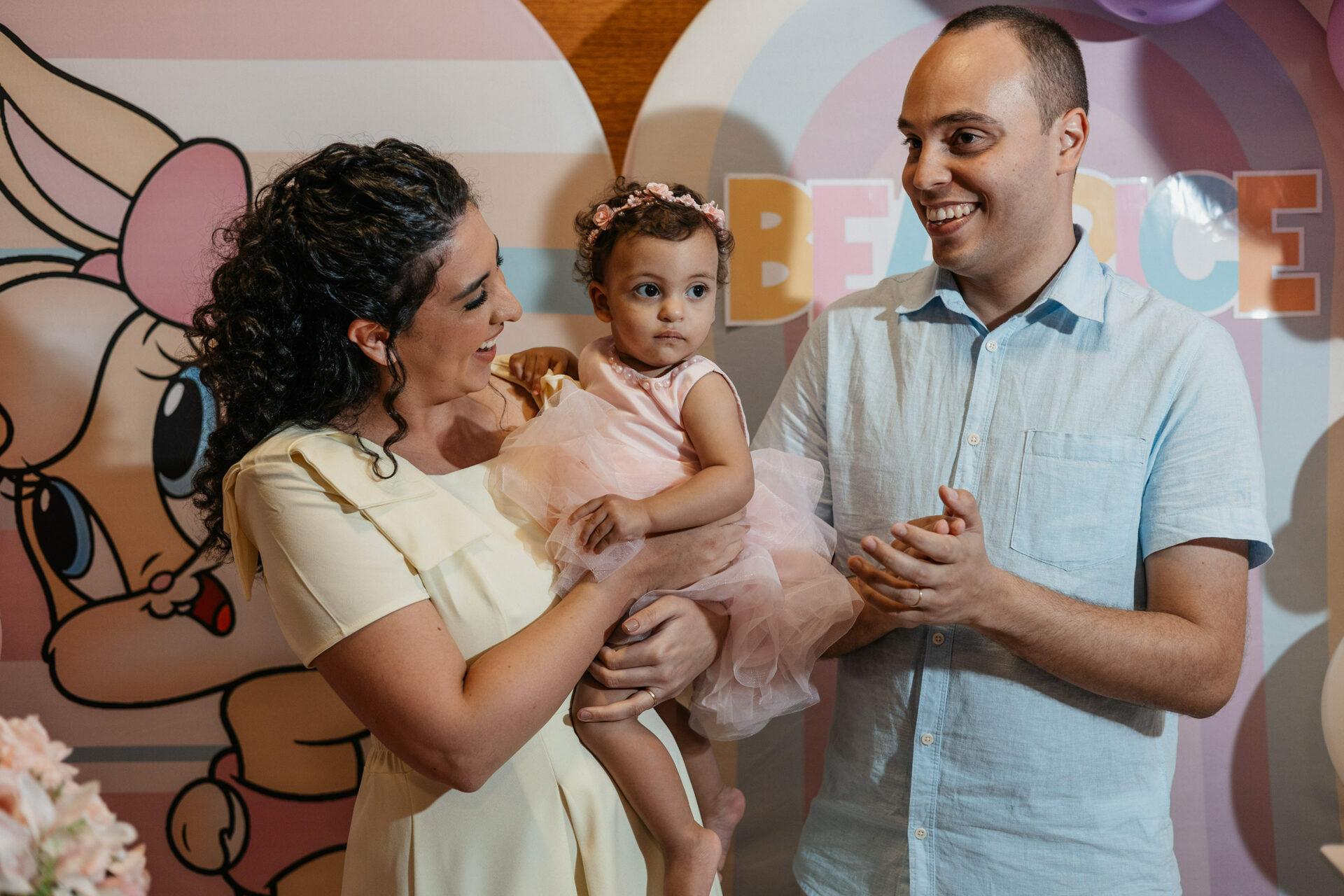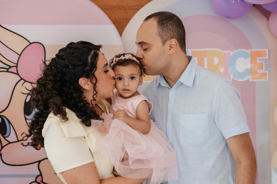 Beatrice, com seu vestido leve e olhar curioso, parecia descobrir o mundo a cada instante. No colo dos pais, entre risos e gestos de carinho, havia algo que não se ensaia: o amor em sua forma mais simples e verdadeira. Os beijos, os sorrisos e as pequenas interações revelavam aquilo que nenhuma produção consegue criar — a conexão real de uma família celebrando um marco tão especial.