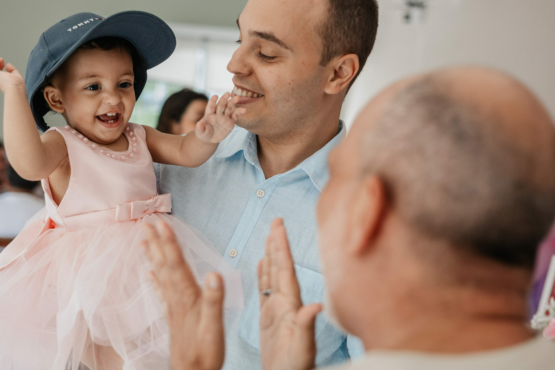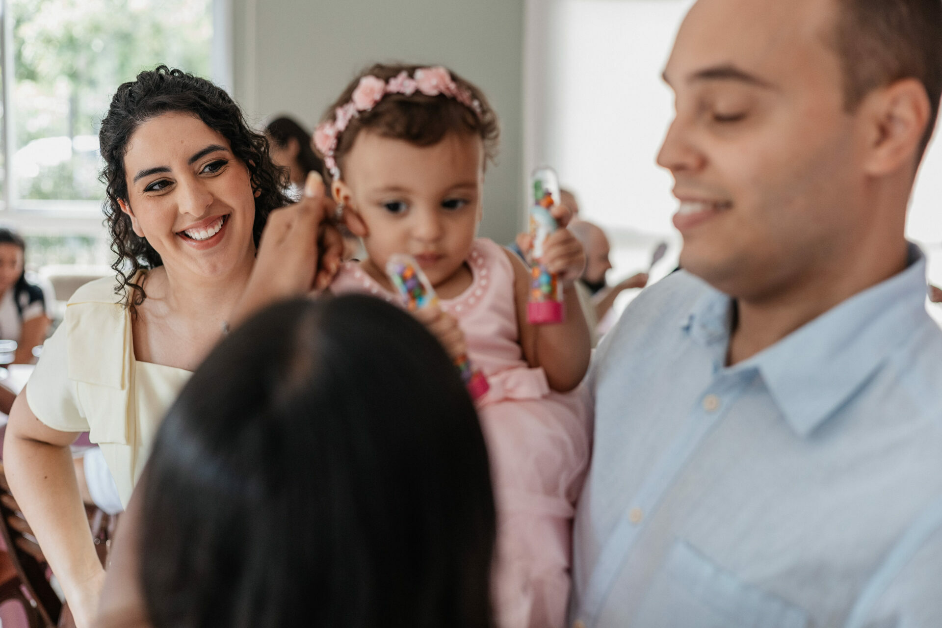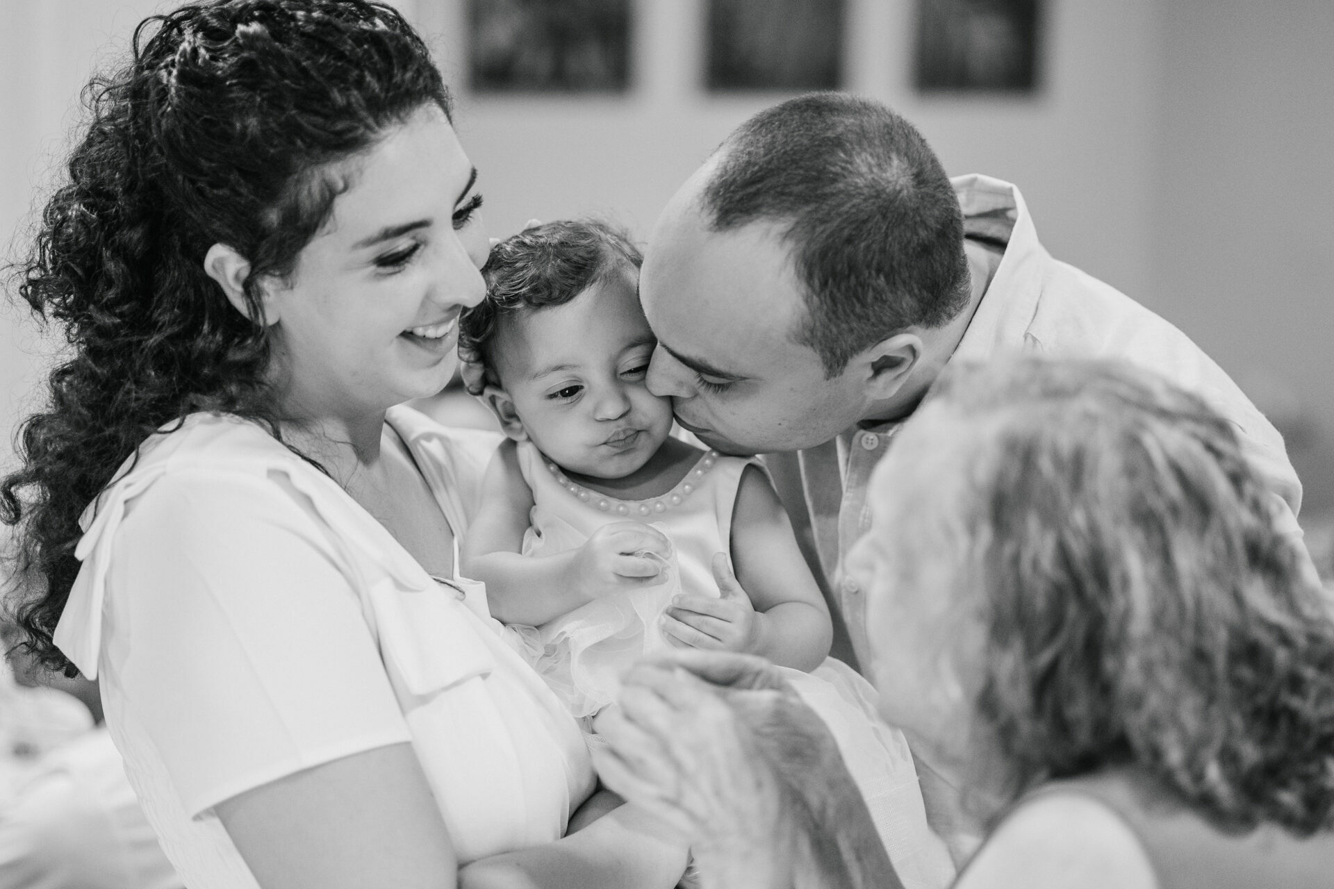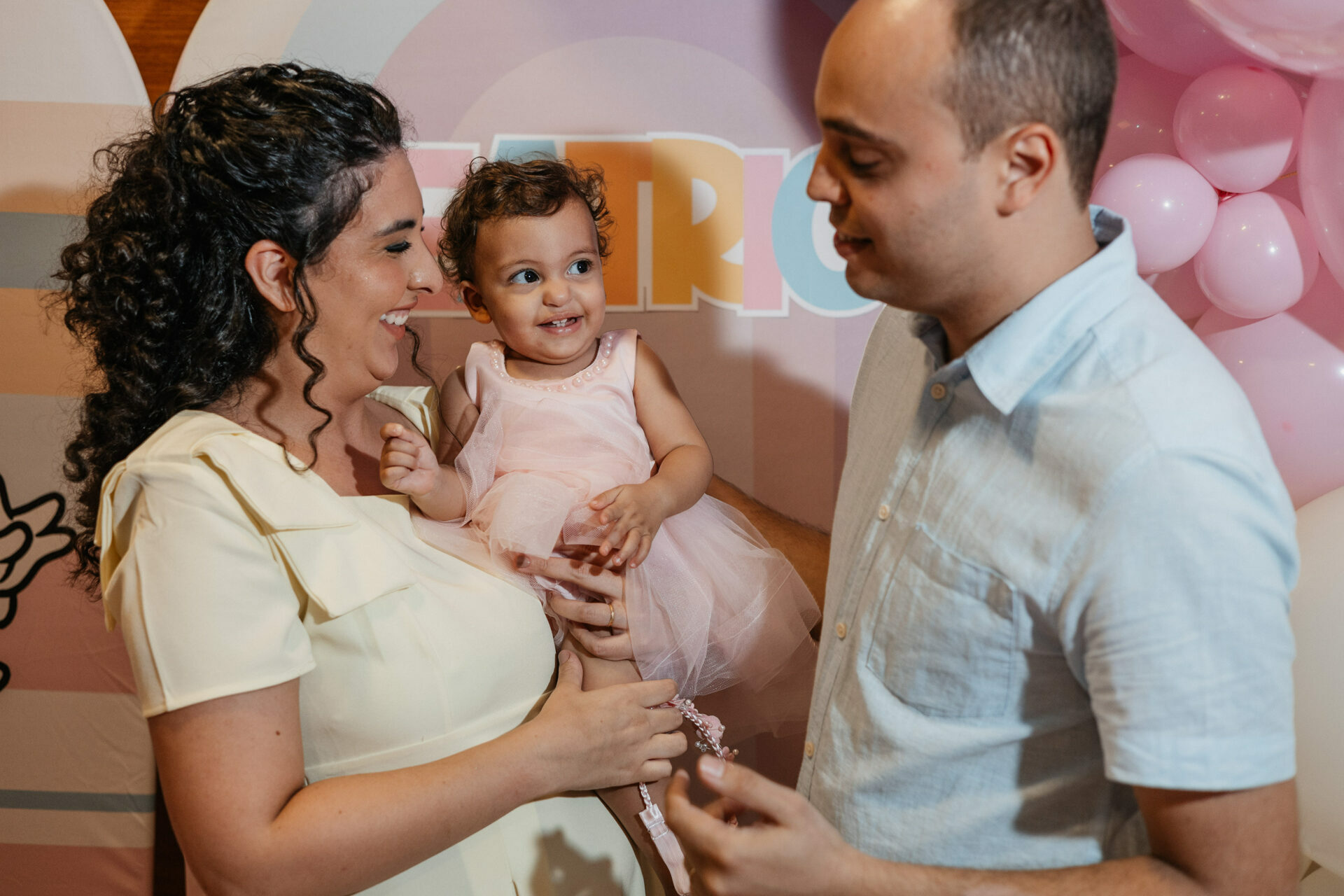 Beatrice, com seu vestido leve e olhar curioso, parecia descobrir o mundo a cada instante. No colo dos pais, entre risos e gestos de carinho, havia algo que não se ensaia: o amor em sua forma mais simples e verdadeira. Os beijos, os sorrisos e as pequenas interações revelavam aquilo que nenhuma produção consegue criar — a conexão real de uma família celebrando um marco tão especial.