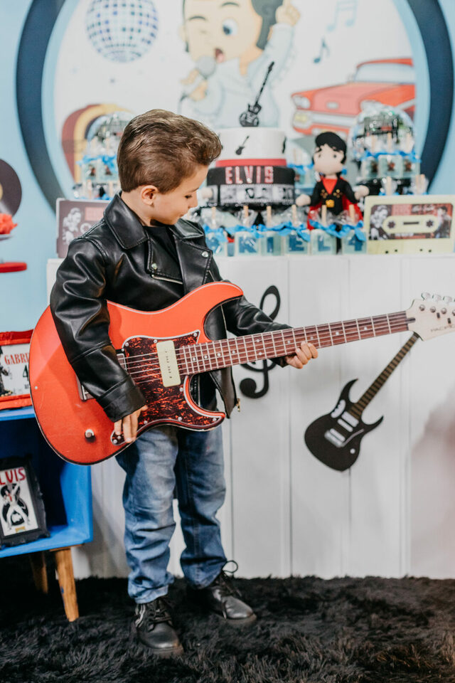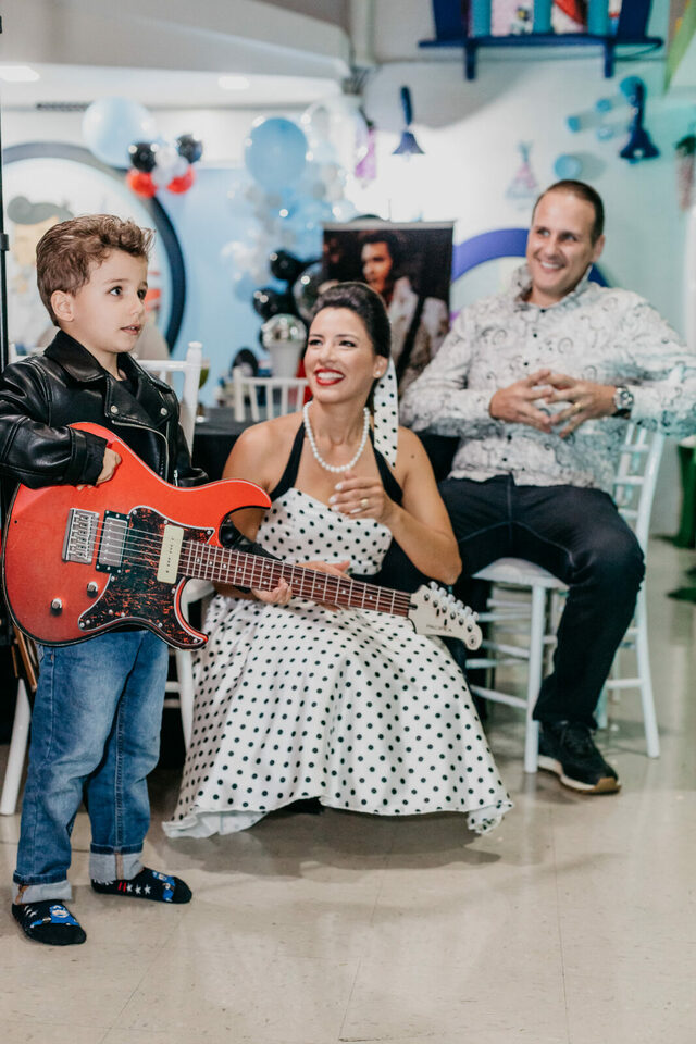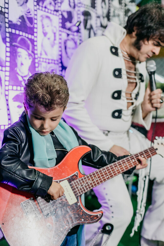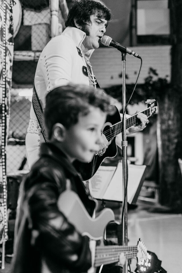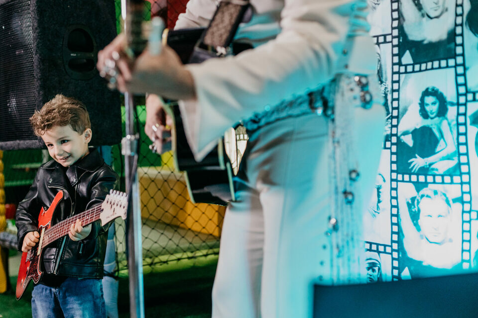 O mais legal de tudo isso, é que a Janaína e o Ricardo, prepararam uma surpresa para o Gabriel. Um show do próprio (cover) do Elvis. E sabe o que o Gabriel fez durante a apresentação? Ficou do lado do seu ídolo, tocando sua guitarra (que era parte da decoração da festa), o tempo todo. Ou seja, fomos brindados com uma apresentação inesquecível dos astros do rock.