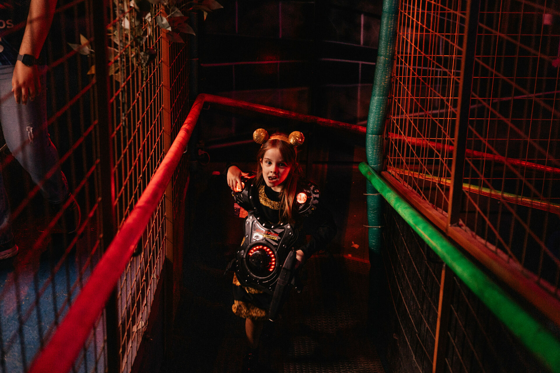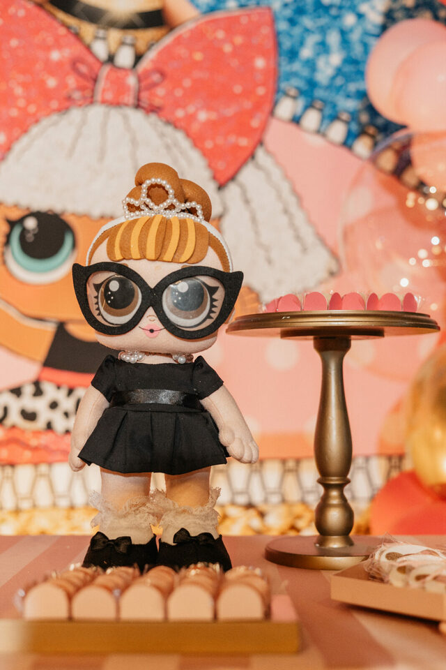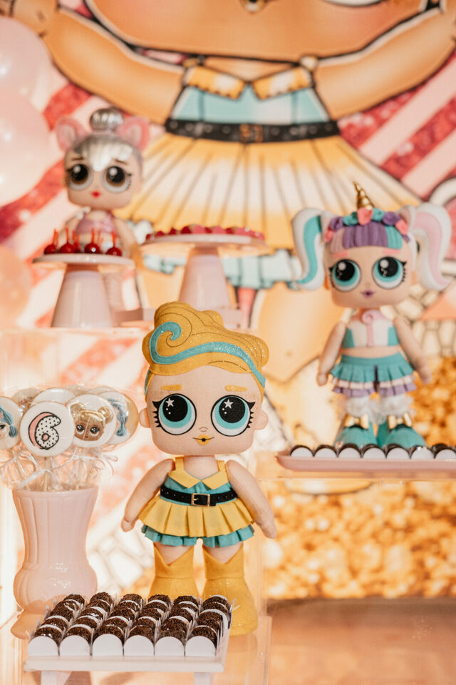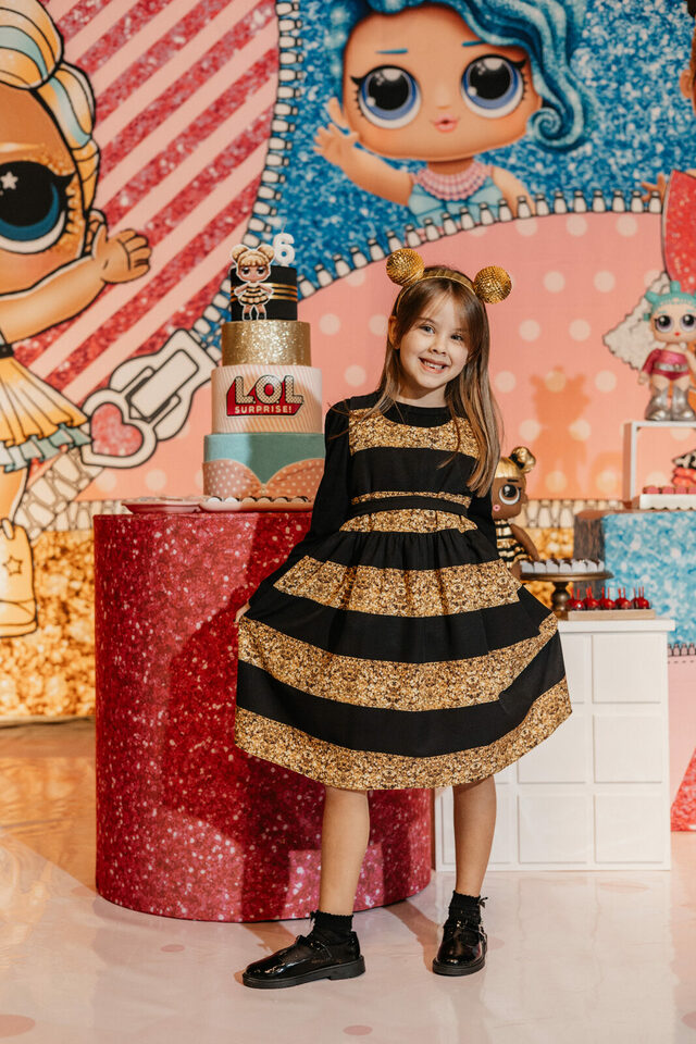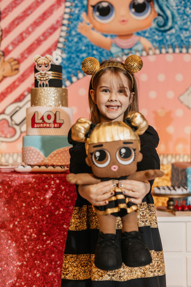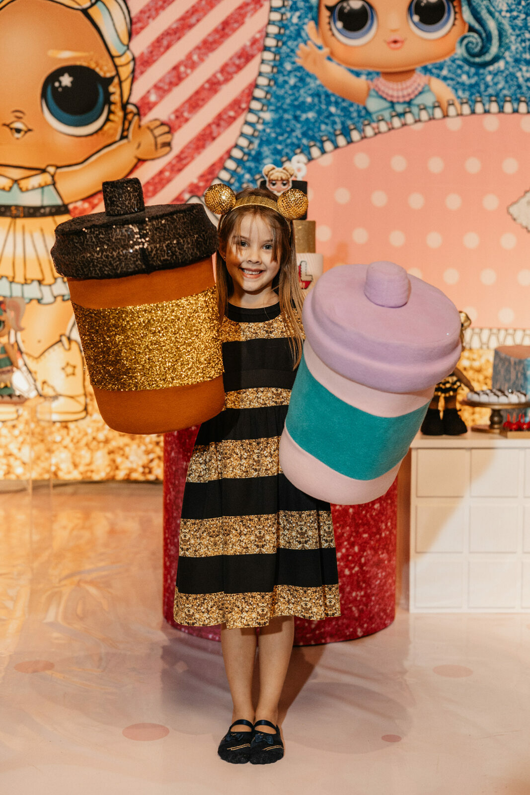 E o melhor? Ela não só escolheu o tema… ela virou o tema. Vestida como uma das personagens LOL, Laura parecia ter saído diretamente de uma das caixas-surpresa para a própria festa. A cada pose espontânea, a cada risada que escapava enquanto ela corria entre os brinquedos, dava pra sentir o quanto ela estava vivendo tudo aquilo com verdade, do jeitinho dela.