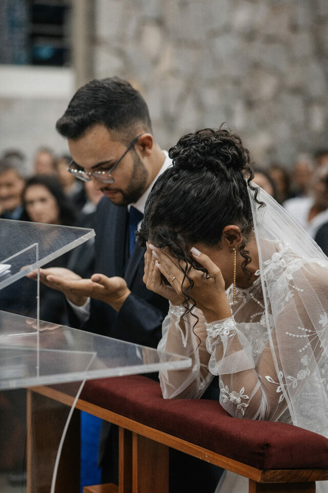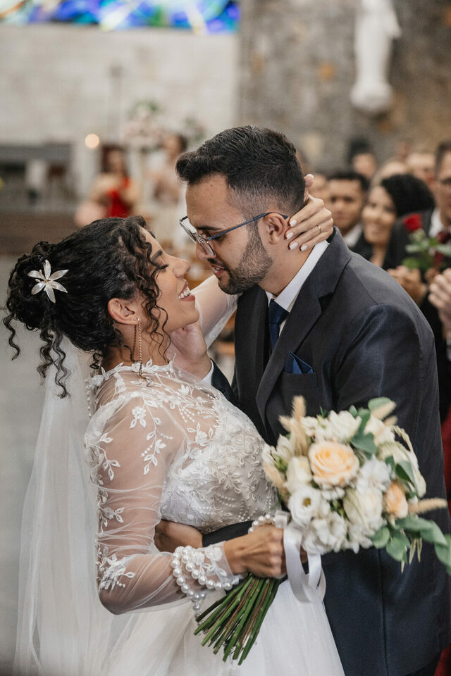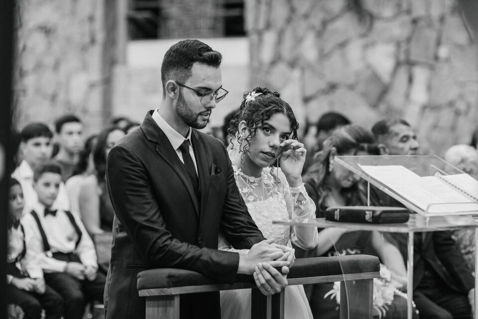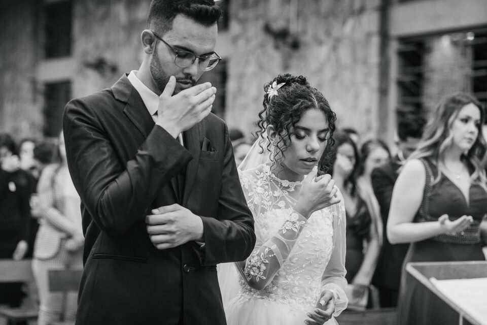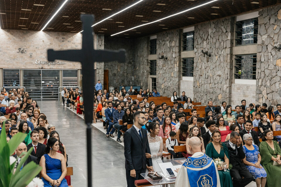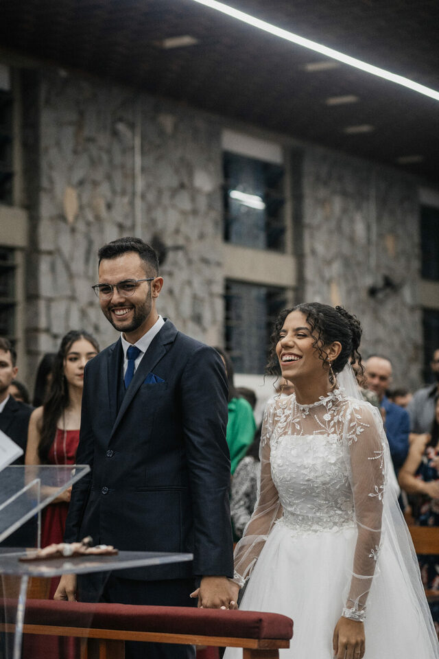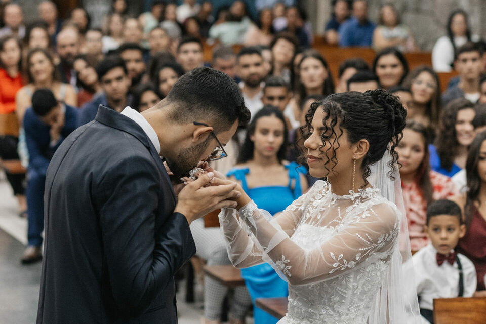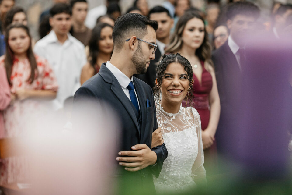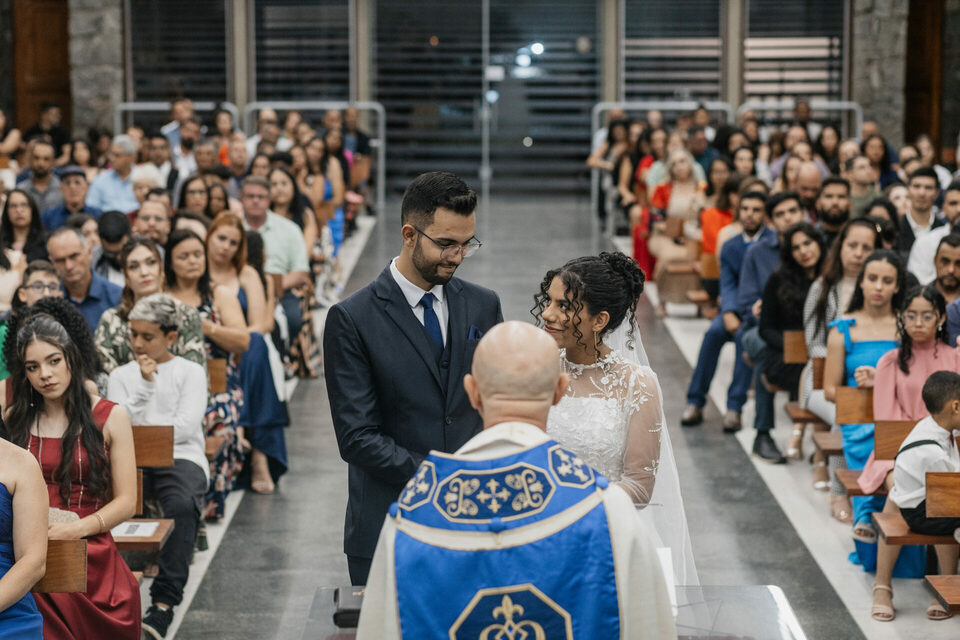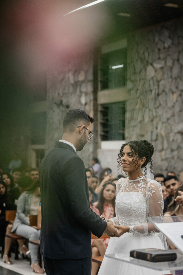 Eles optaram por uma celebração simples, mas a emoção estava em cada sorriso, olhar e momento. O casal, super conectado com a igreja, transformou a cerimônia em algo ainda mais especial. Dá pra ver que eles participam bastante da comunidade religiosa, tanto que os amigos não só estavam presentes, mas também cantaram durante a cerimônia, deixando tudo ainda mais bonito e emocionante.