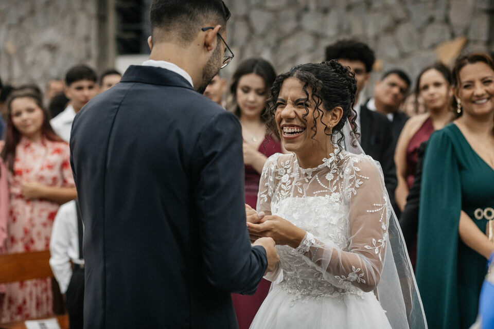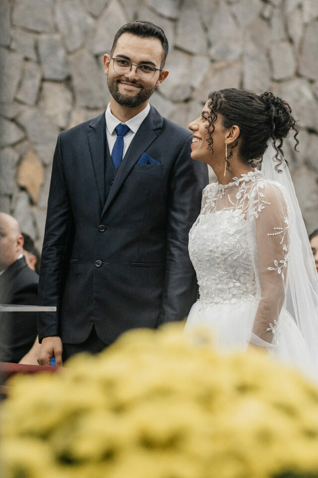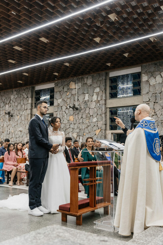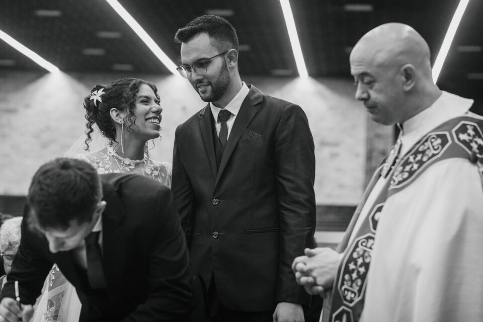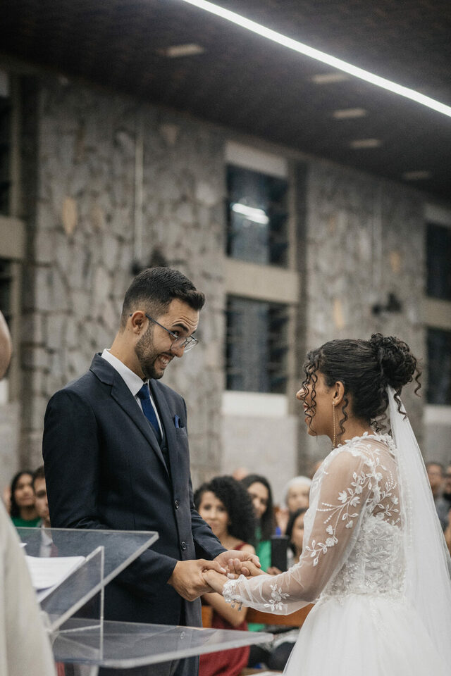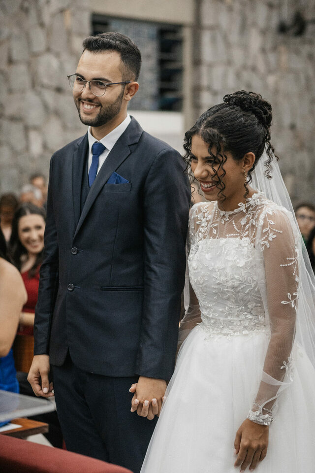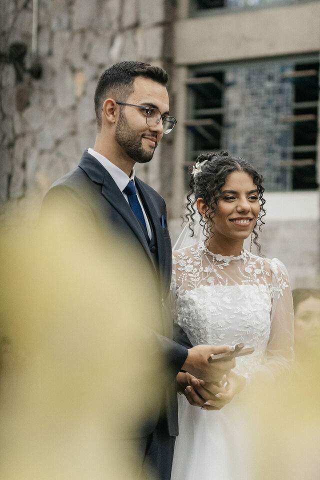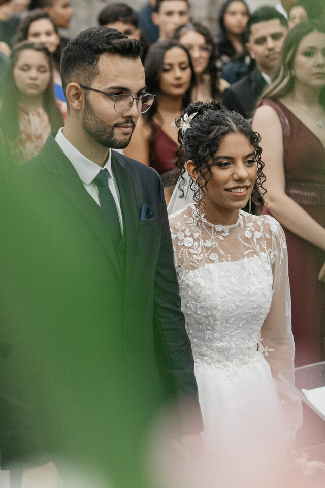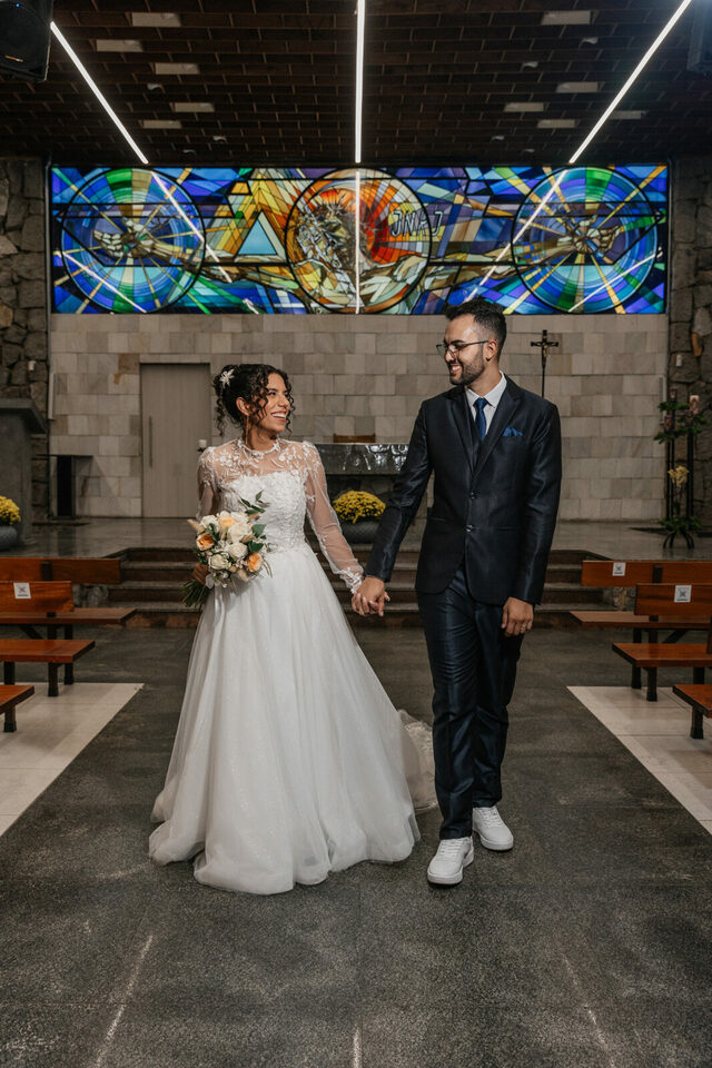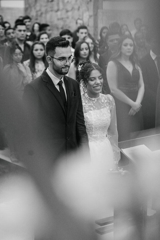 Eles optaram por uma celebração simples, mas a emoção estava em cada sorriso, olhar e momento. O casal, super conectado com a igreja, transformou a cerimônia em algo ainda mais especial. Dá pra ver que eles participam bastante da comunidade religiosa, tanto que os amigos não só estavam presentes, mas também cantaram durante a cerimônia, deixando tudo ainda mais bonito e emocionante.