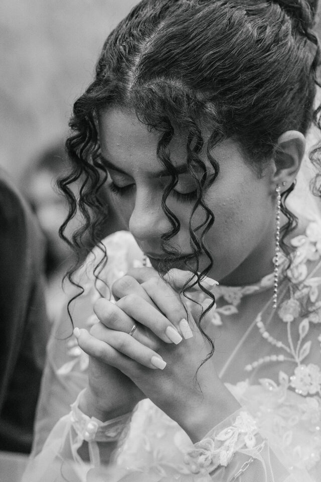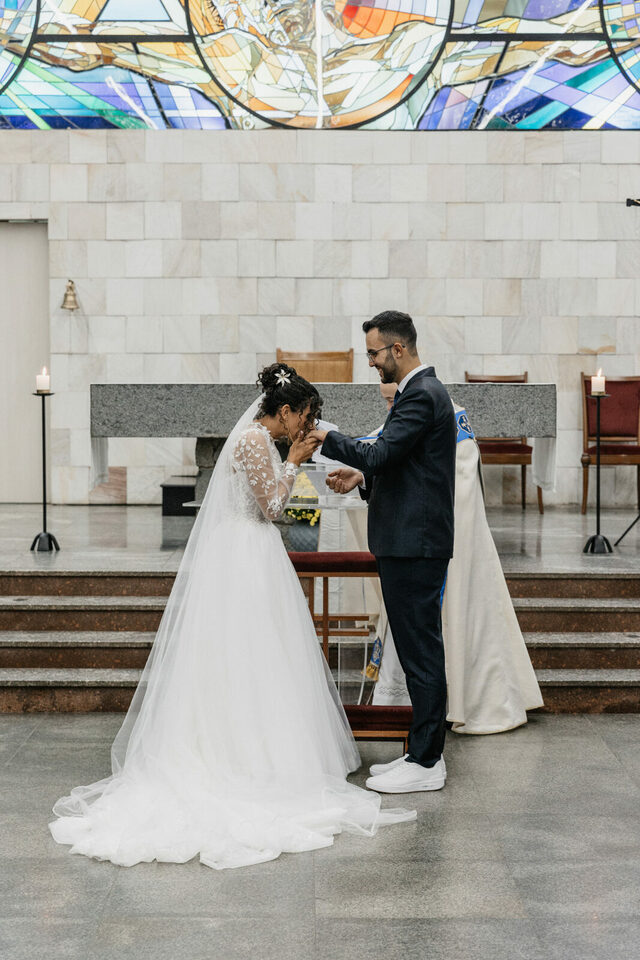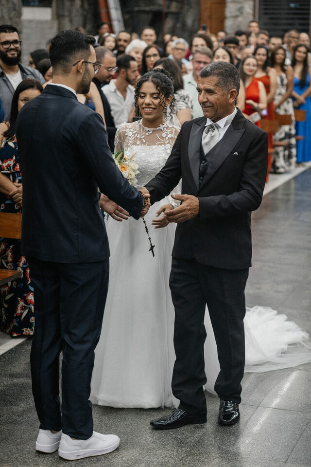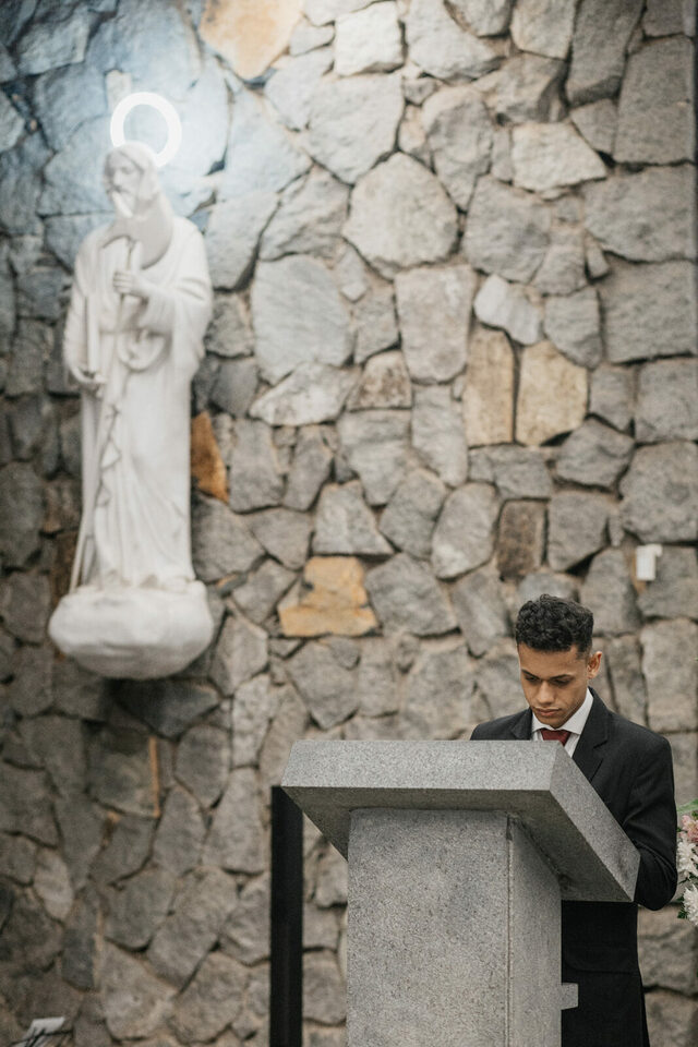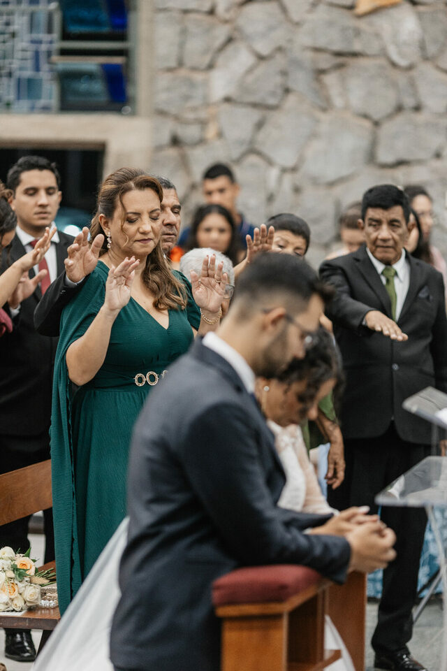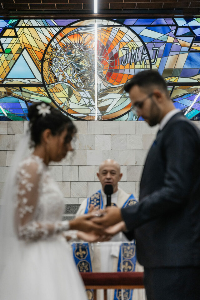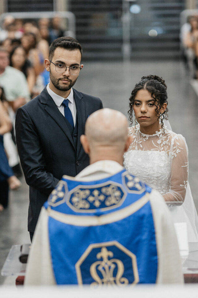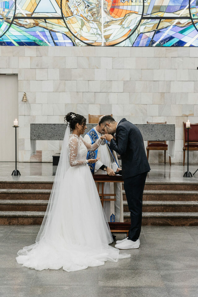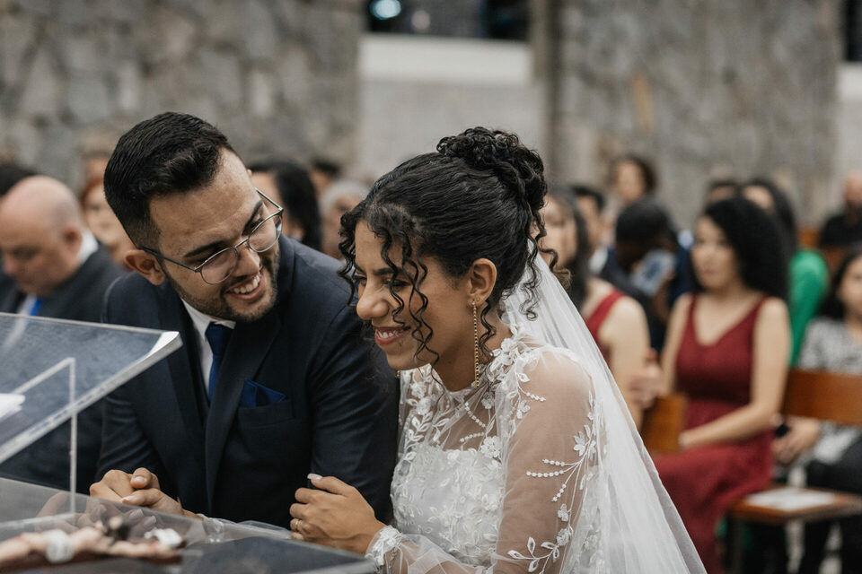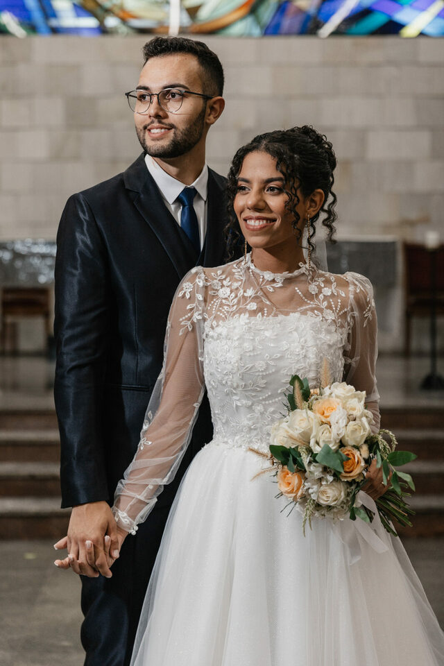 Eles optaram por uma celebração simples, mas a emoção estava em cada sorriso, olhar e momento. O casal, super conectado com a igreja, transformou a cerimônia em algo ainda mais especial. Dá pra ver que eles participam bastante da comunidade religiosa, tanto que os amigos não só estavam presentes, mas também cantaram durante a cerimônia, deixando tudo ainda mais bonito e emocionante.