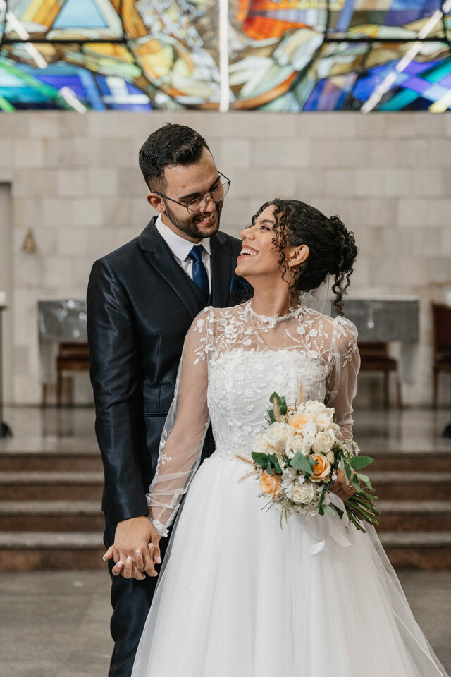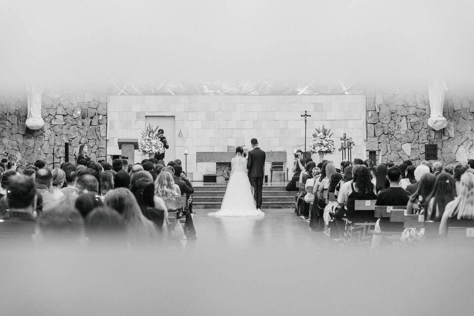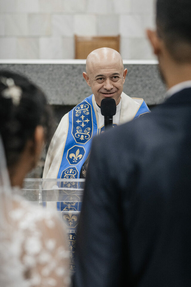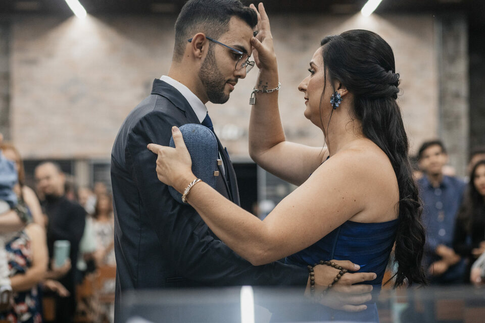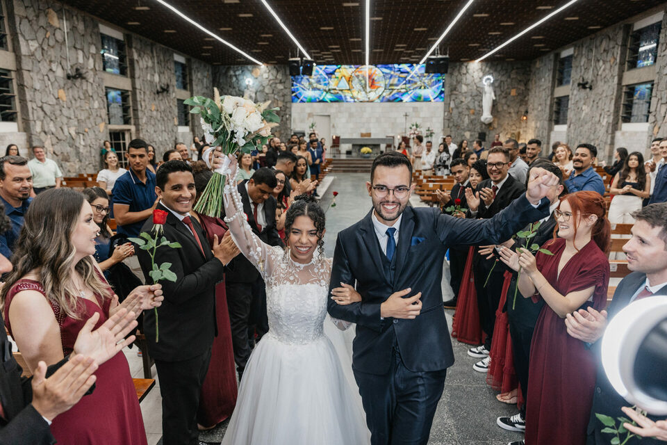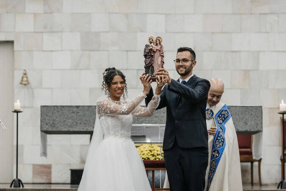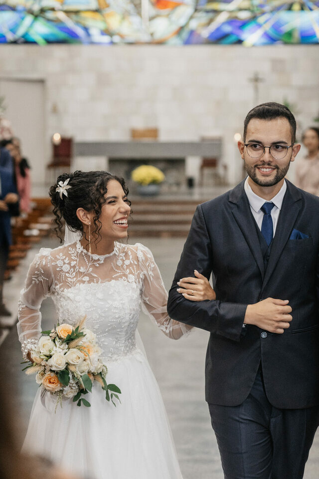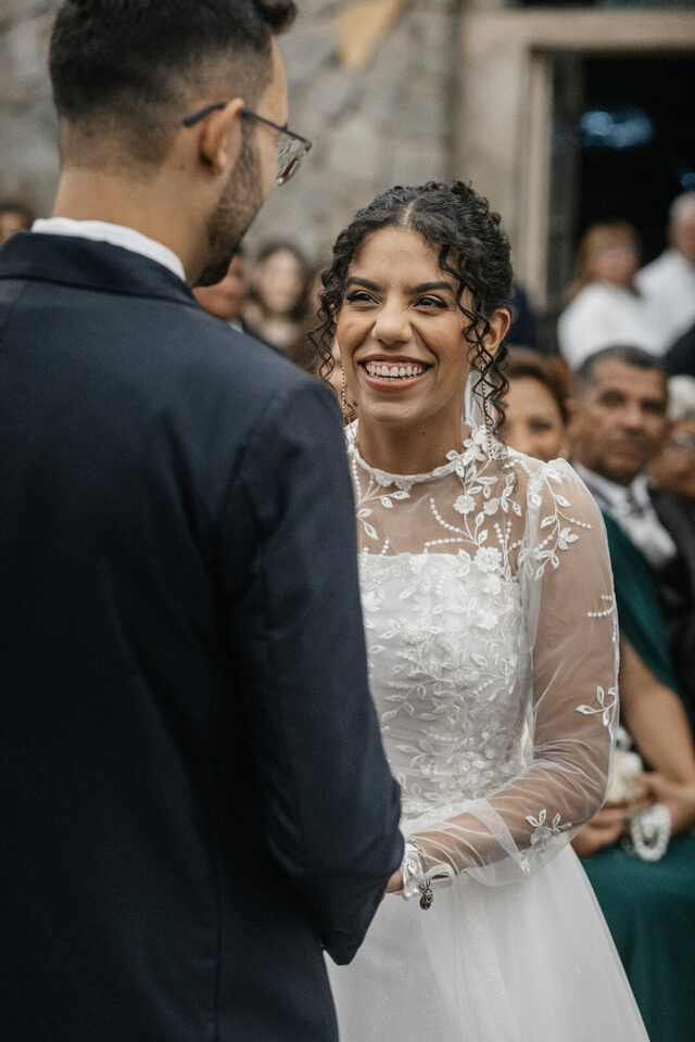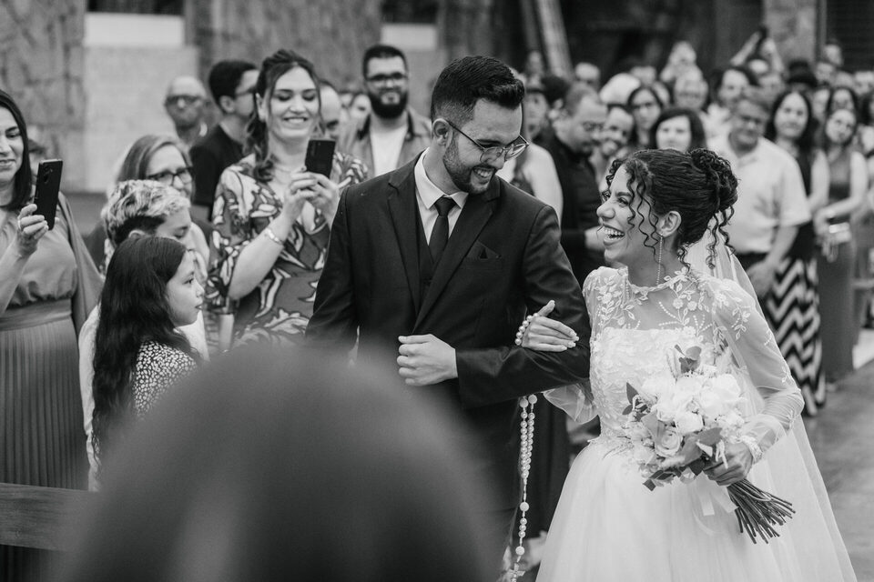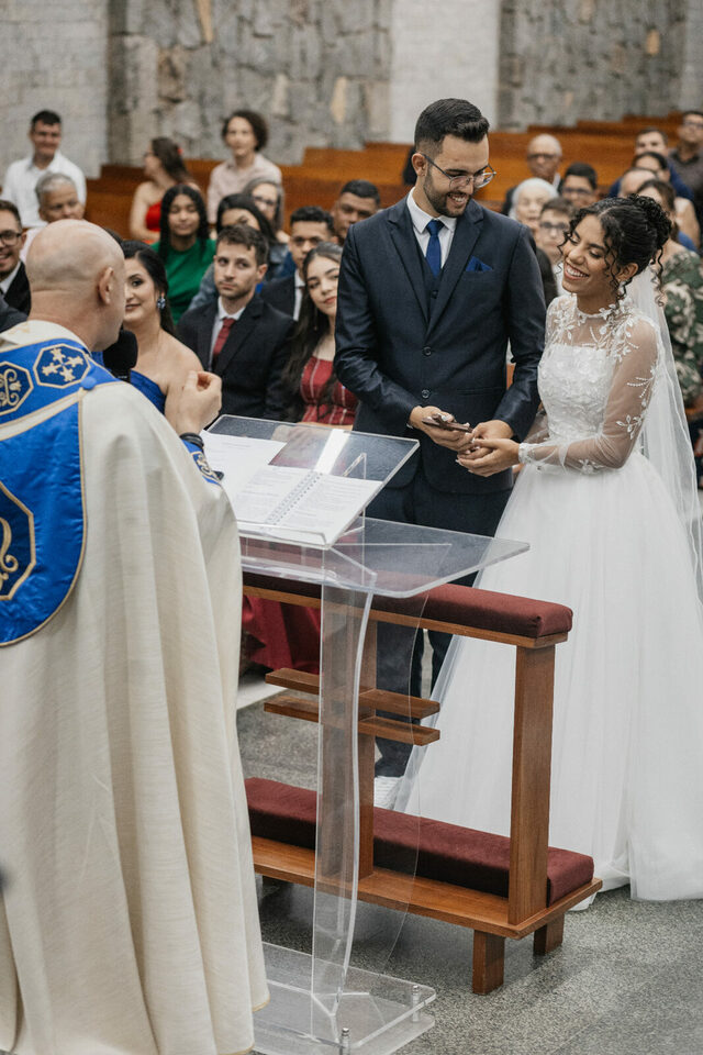 Eles optaram por uma celebração simples, mas a emoção estava em cada sorriso, olhar e momento. O casal, super conectado com a igreja, transformou a cerimônia em algo ainda mais especial. Dá pra ver que eles participam bastante da comunidade religiosa, tanto que os amigos não só estavam presentes, mas também cantaram durante a cerimônia, deixando tudo ainda mais bonito e emocionante.