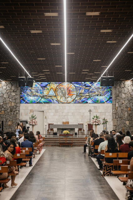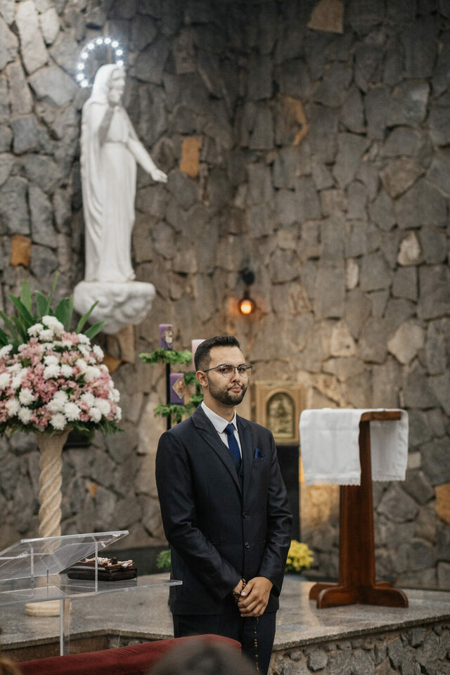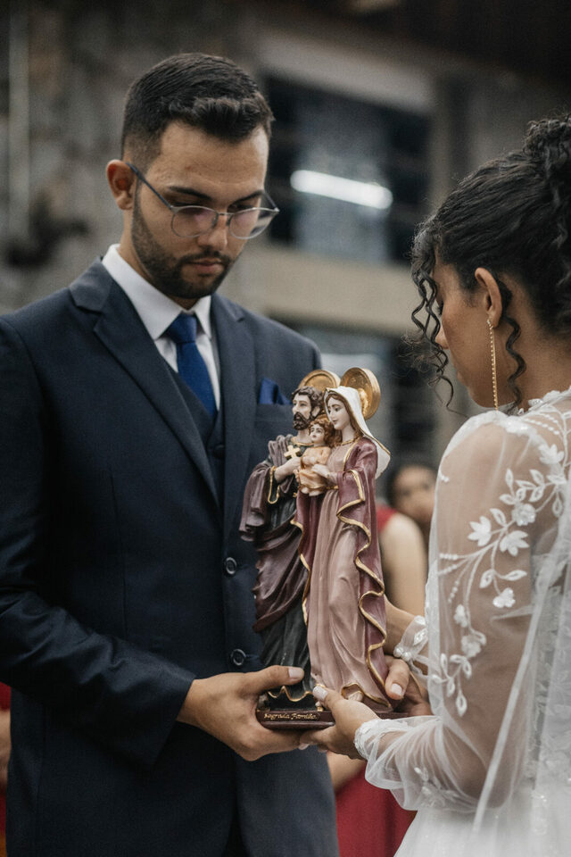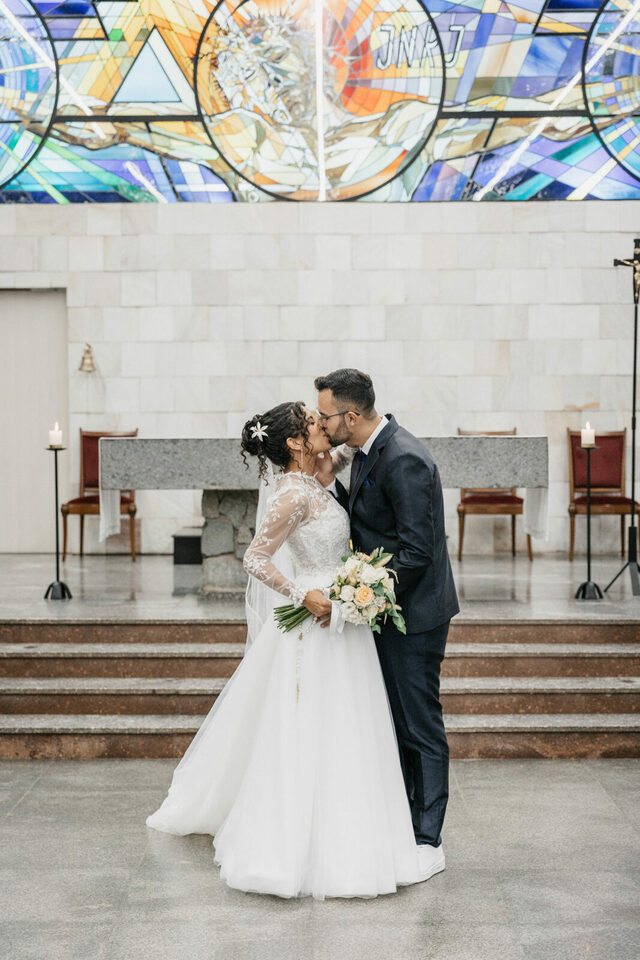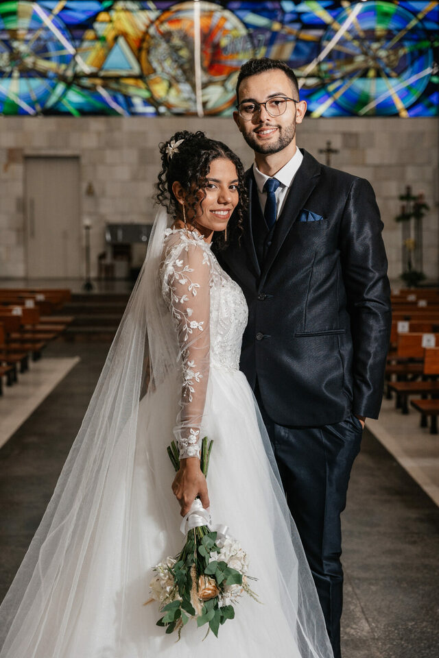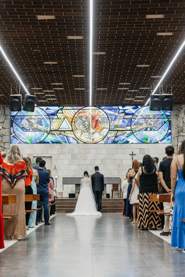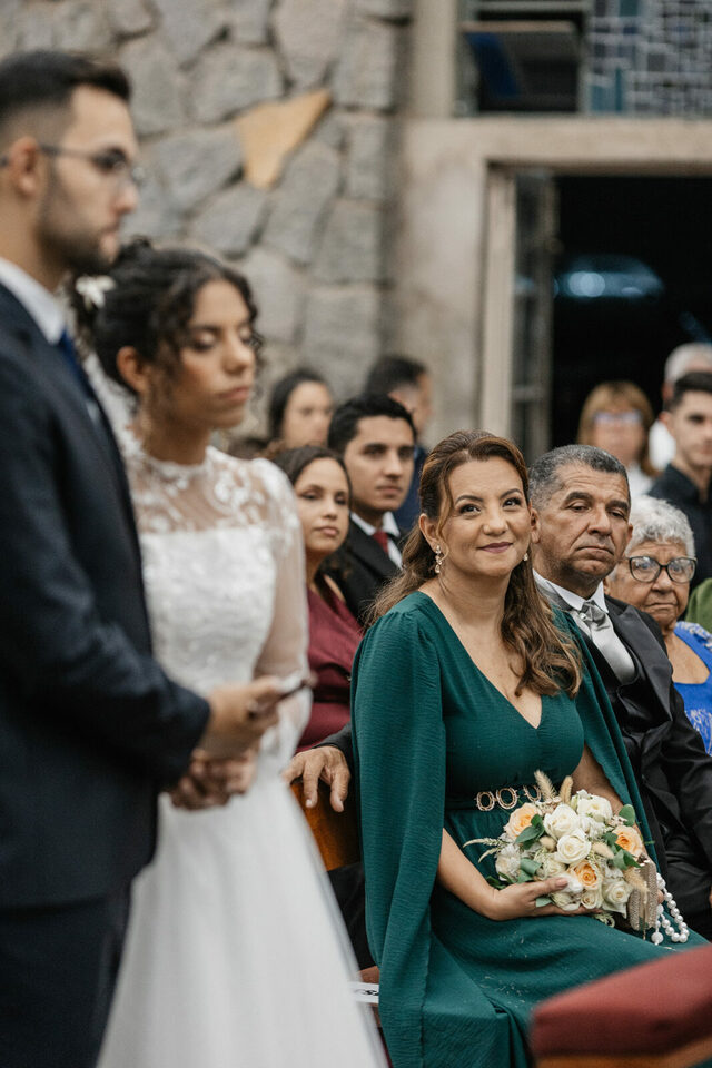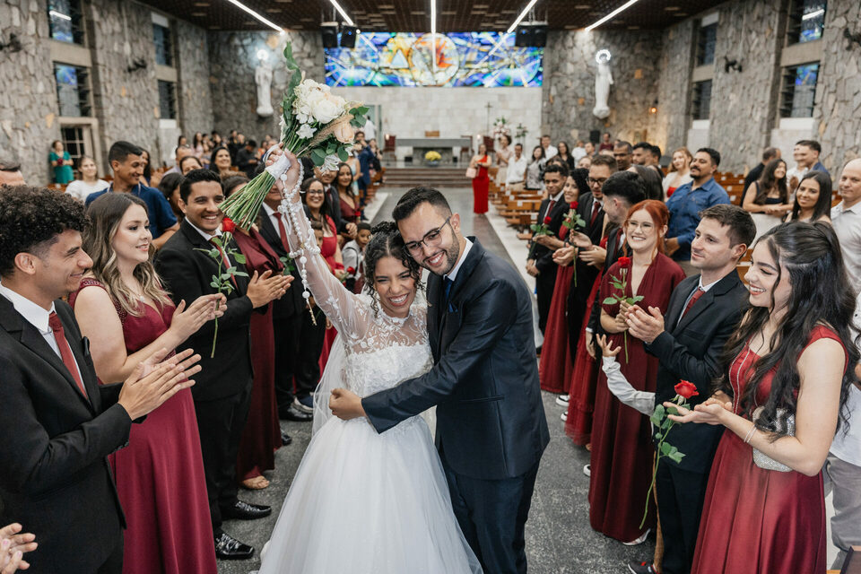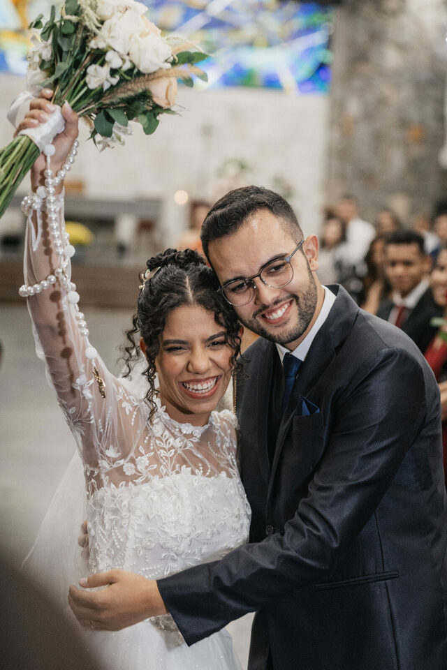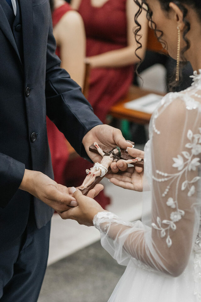 Eles optaram por uma celebração simples, mas a emoção estava em cada sorriso, olhar e momento. O casal, super conectado com a igreja, transformou a cerimônia em algo ainda mais especial. Dá pra ver que eles participam bastante da comunidade religiosa, tanto que os amigos não só estavam presentes, mas também cantaram durante a cerimônia, deixando tudo ainda mais bonito e emocionante.
